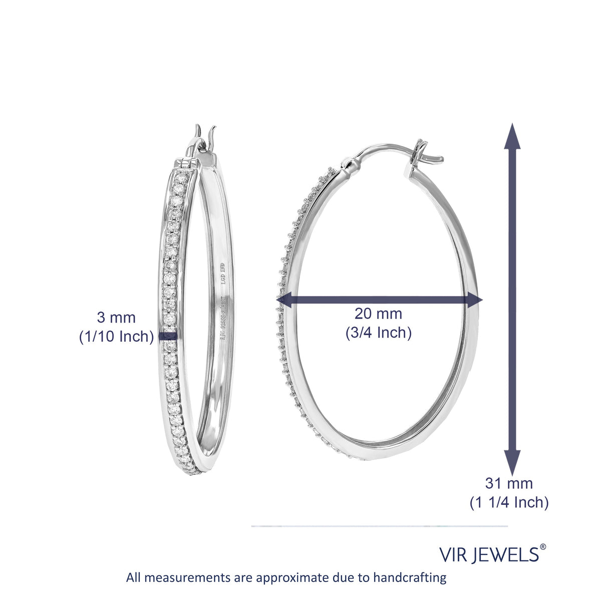 These Round Lab Grown Diamond Hoop Earrings by Vir Jewels offer a dazzling display of brilliance with 54 shimmering diamonds set in a classic prong setting. Designed to capture and reflect light from every angle, these hoops exude timeless sophistication. Their sleek sterling silver frame enhances durability while providing a radiant shine. Measuring 3/4 inch in diameter, they make the perfect choice for both everyday elegance and special occasions.