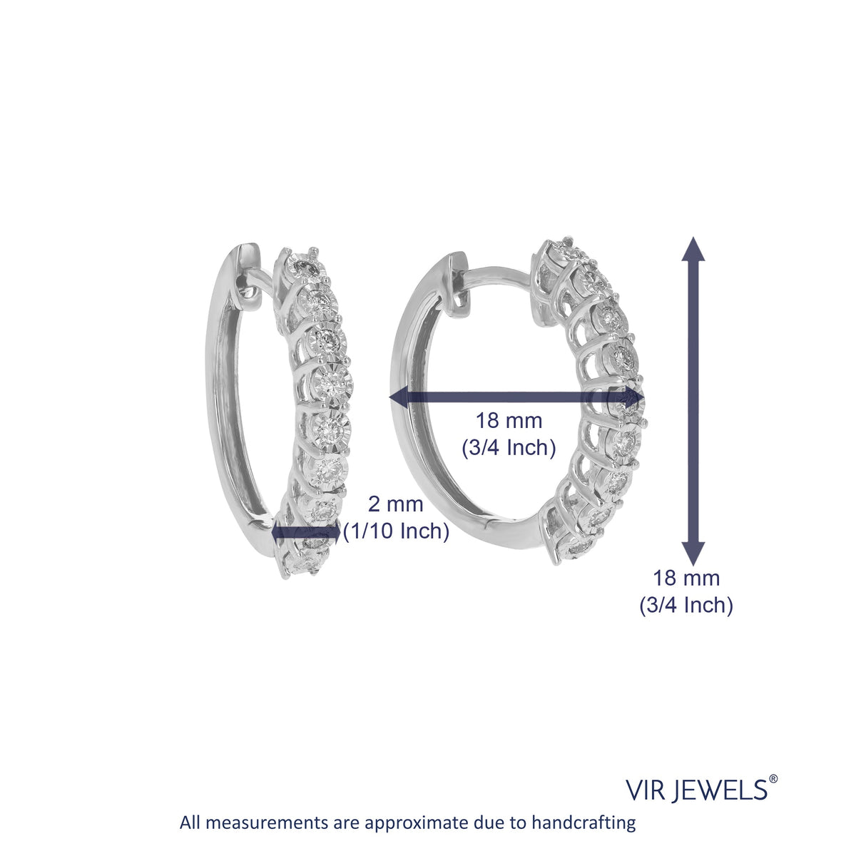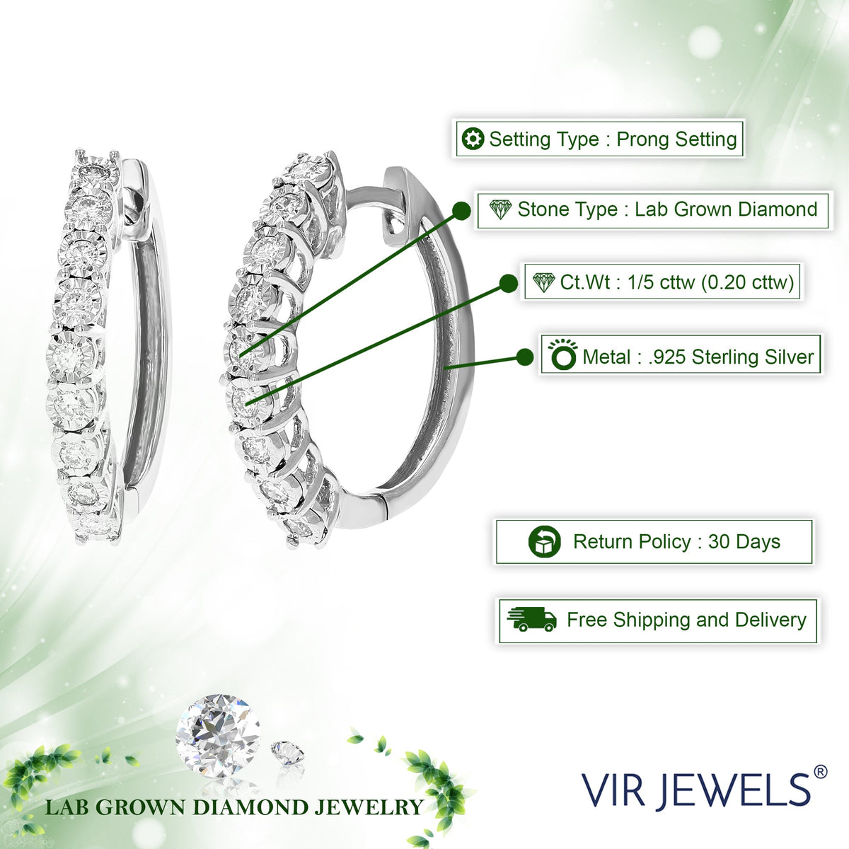 These 1/5 cttw Round Lab Grown Diamond Hoop Earrings by Vir Jewels are the perfect addition to any jewelry collection. With 18 round diamonds set in a prong setting, these earrings sparkle with brilliance. The sterling silver design ensures both durability and elegance, while the 1-inch hoop length offers a sophisticated look for any occasion.