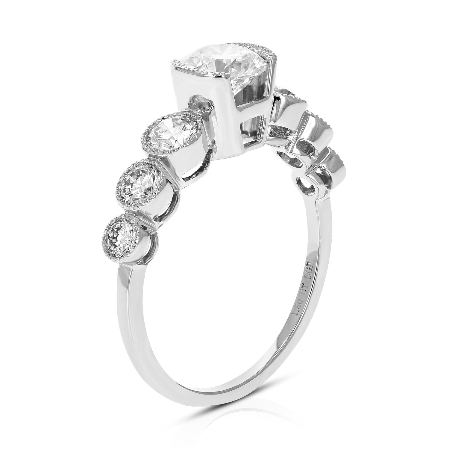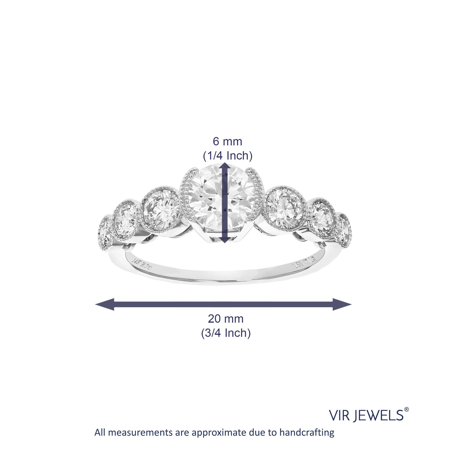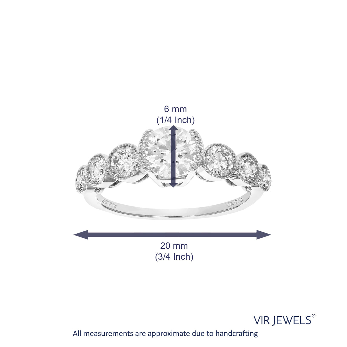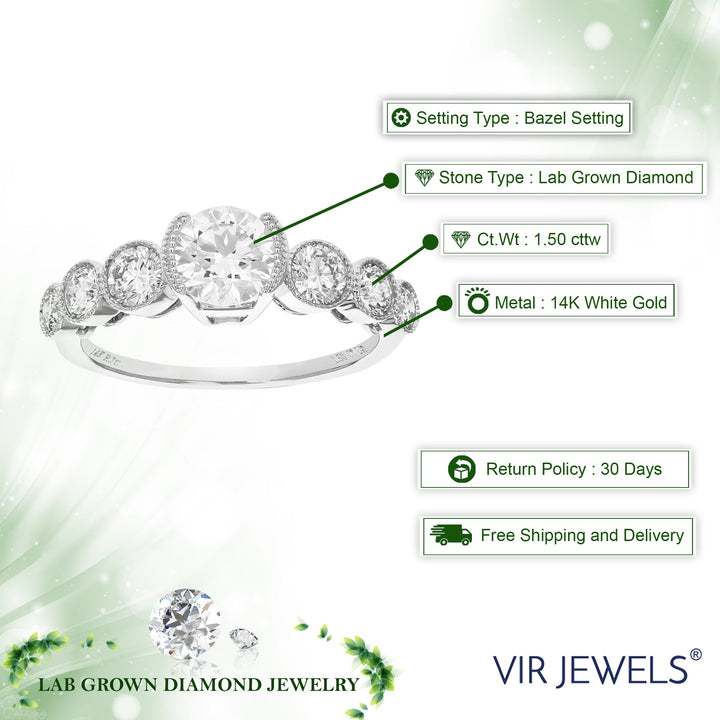 The 1.50 cttw Round Lab Grown Diamond Engagement Ring in 14K White Gold by Vir Jewels is a classic piece featuring a round-cut diamond center stone surrounded by six side stones in a bezel setting. The ring’s elegant design and total carat weight of 1.50 cttw make it a perfect choice for engagement or special occasions.