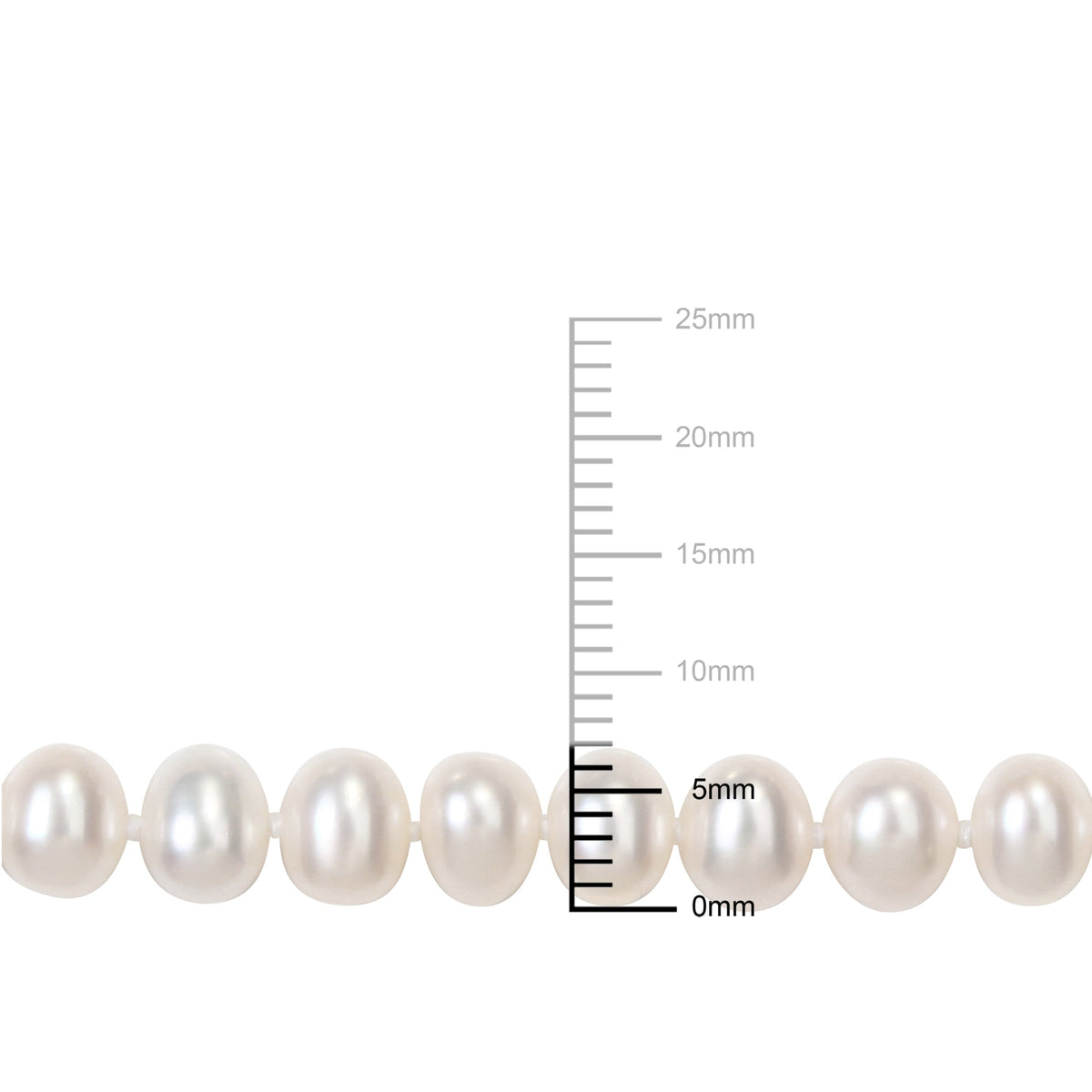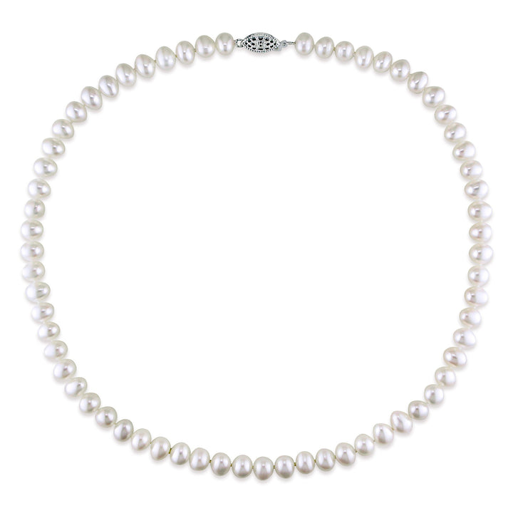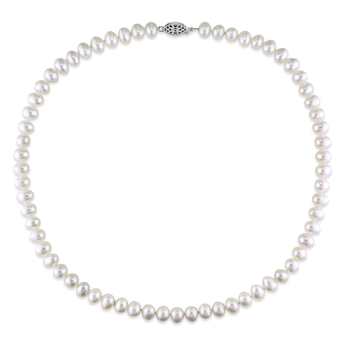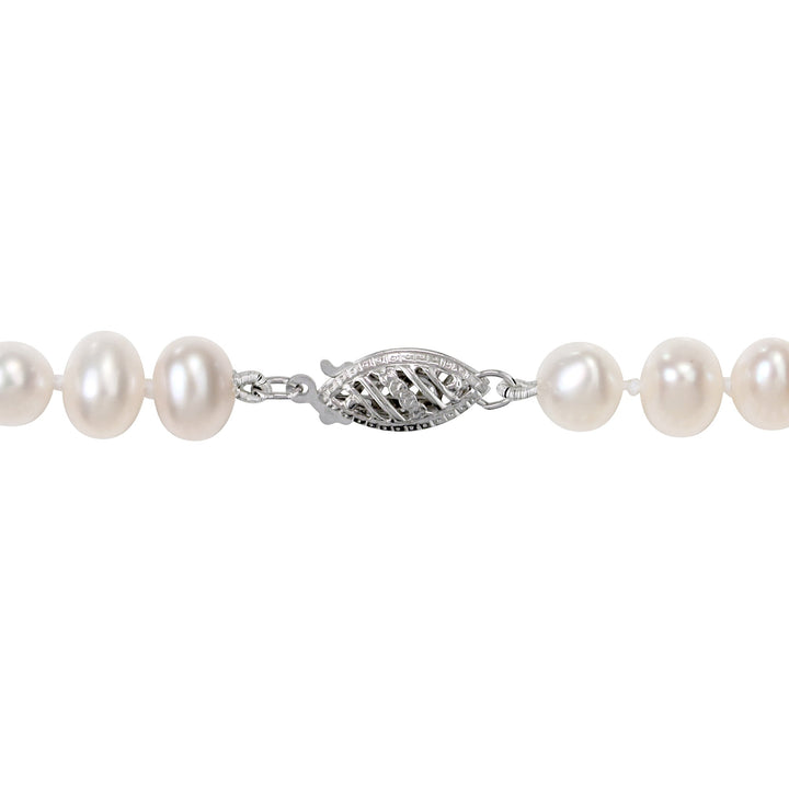 Crafted with A-grade white freshwater pearls, 6.5-7mm in size, in a potato shape. Sterling silver fisheye clasp. Necklace length: 18 inches. High polish finish.