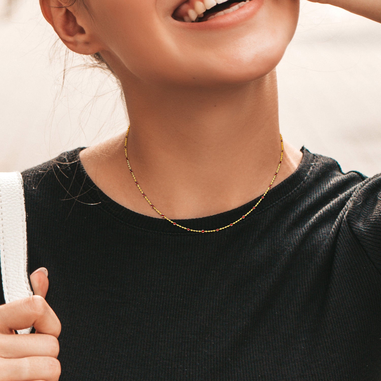 This Mimi & Max Red Enamel Bead Station Necklace in Yellow Plated Sterling Silver adds a bold pop of color to your wardrobe. The necklace features glossy red enamel beads spaced evenly along a delicate yellow-plated sterling silver chain. At 18 inches in length with a 1-inch extender, this necklace can be adjusted to your preferred fit. The red enamel beads bring a playful yet sophisticated vibe, making this piece perfect for layering or wearing alone to make a statement.