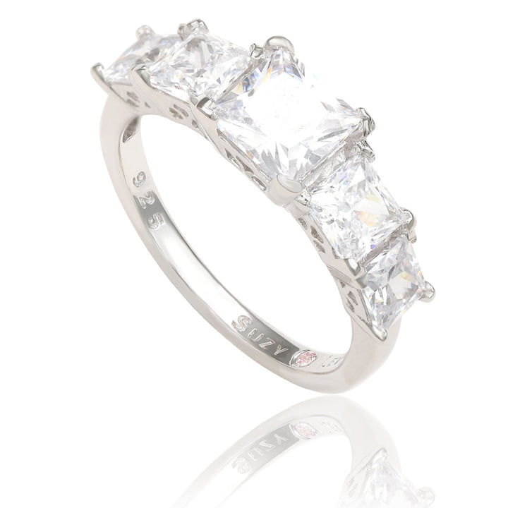 Crafted in sterling silver with five Asscher-cut white cubic zirconia stones. Features a comfort-fit closed under-gallery for a luxurious feel.