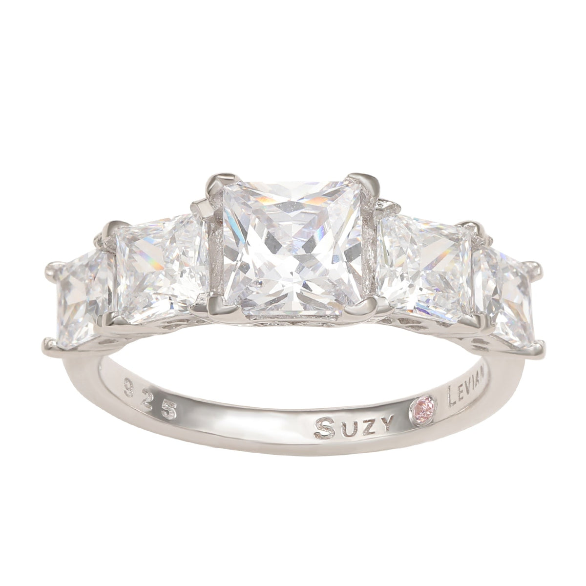 This Graduating Asscher-Cut White Cubic Zirconia Ring by Suzy Levian is a dazzling expression of elegance. Five radiant Asscher-cut stones, meticulously prong-set in sterling silver, create a captivating play of light with their step-cut facets. Designed with intricate details from every angle, this piece is more than just an anniversary band—it’s a statement of timeless beauty. A hidden stone within the shank, Suzy Levian’s signature touch, symbolizes the strength and power found within every woman.