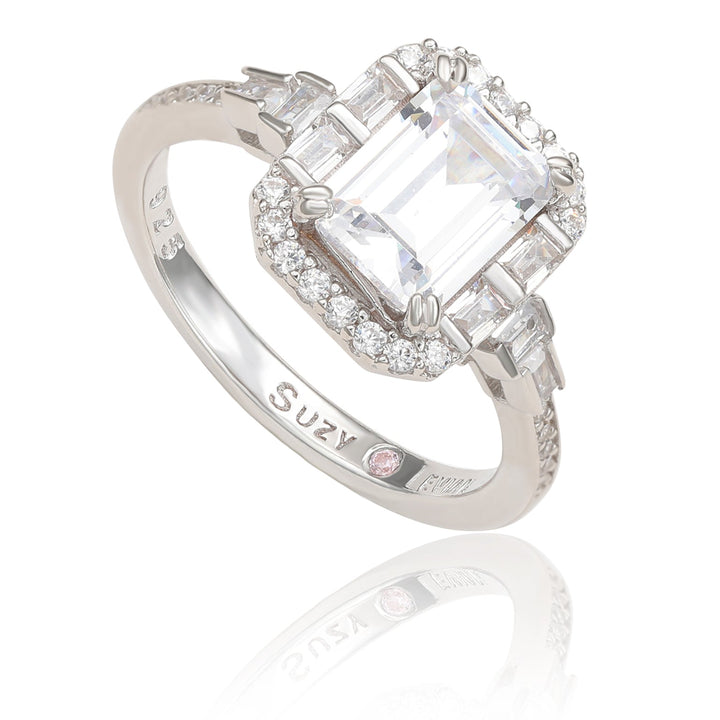 Crafted in sterling silver with rose gold plating, featuring a 6.8mm emerald-cut white cubic zirconia, 0.50 carats of round-cut cubic zirconias, and baguette-cut cubic zirconias. Includes a hidden gemstone inside the shank.