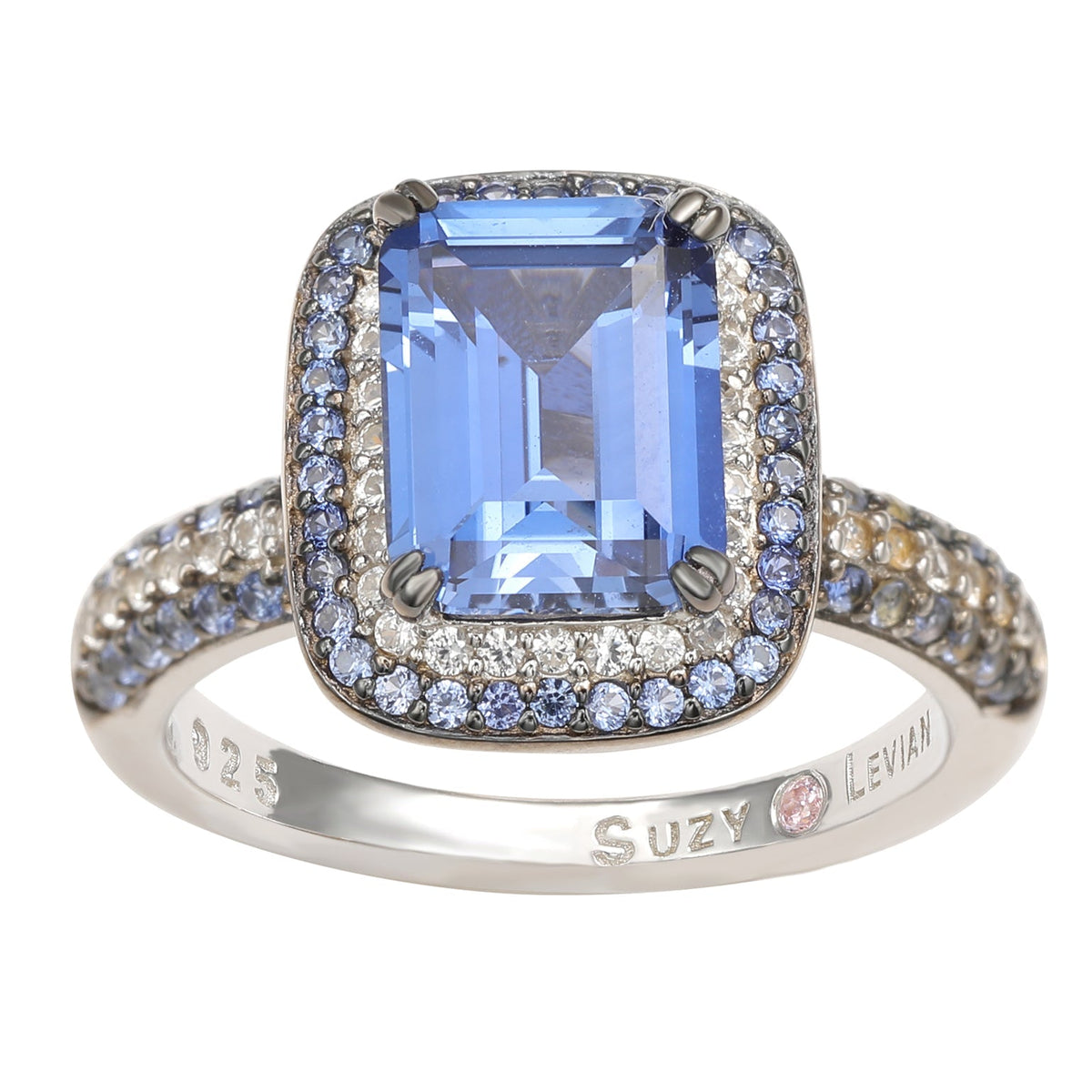 This Suzy Levian Sterling Silver Blue Sapphire Diamond Accent Halo Ring is a striking piece designed to celebrate love and inner strength. Featuring a stunning emerald-cut blue sapphire at the center, it is surrounded by a double halo of created white sapphire and blue sapphire, accented with pave sapphires continuing down the band. A hidden secret diamond, set in the shank, represents inner beauty and empowerment. The ring is designed with a closed undergallery and features an 18k yellow gold SL logo for added authenticity.