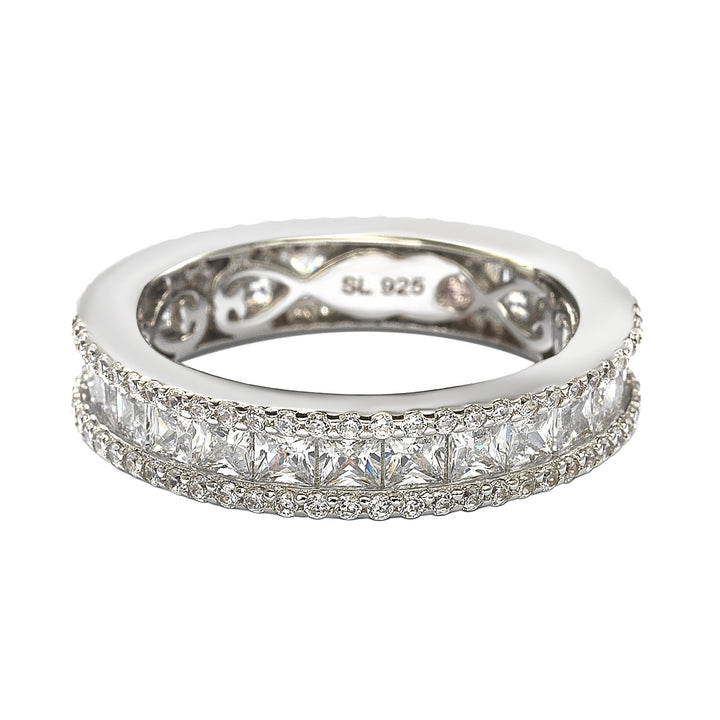 Crafted in sterling silver with a row of princess-cut cubic zirconia and round-cut cubic zirconia accents. Hidden stone inside the band. Available in various sizes.