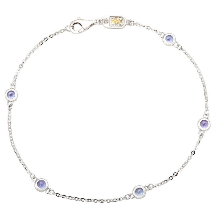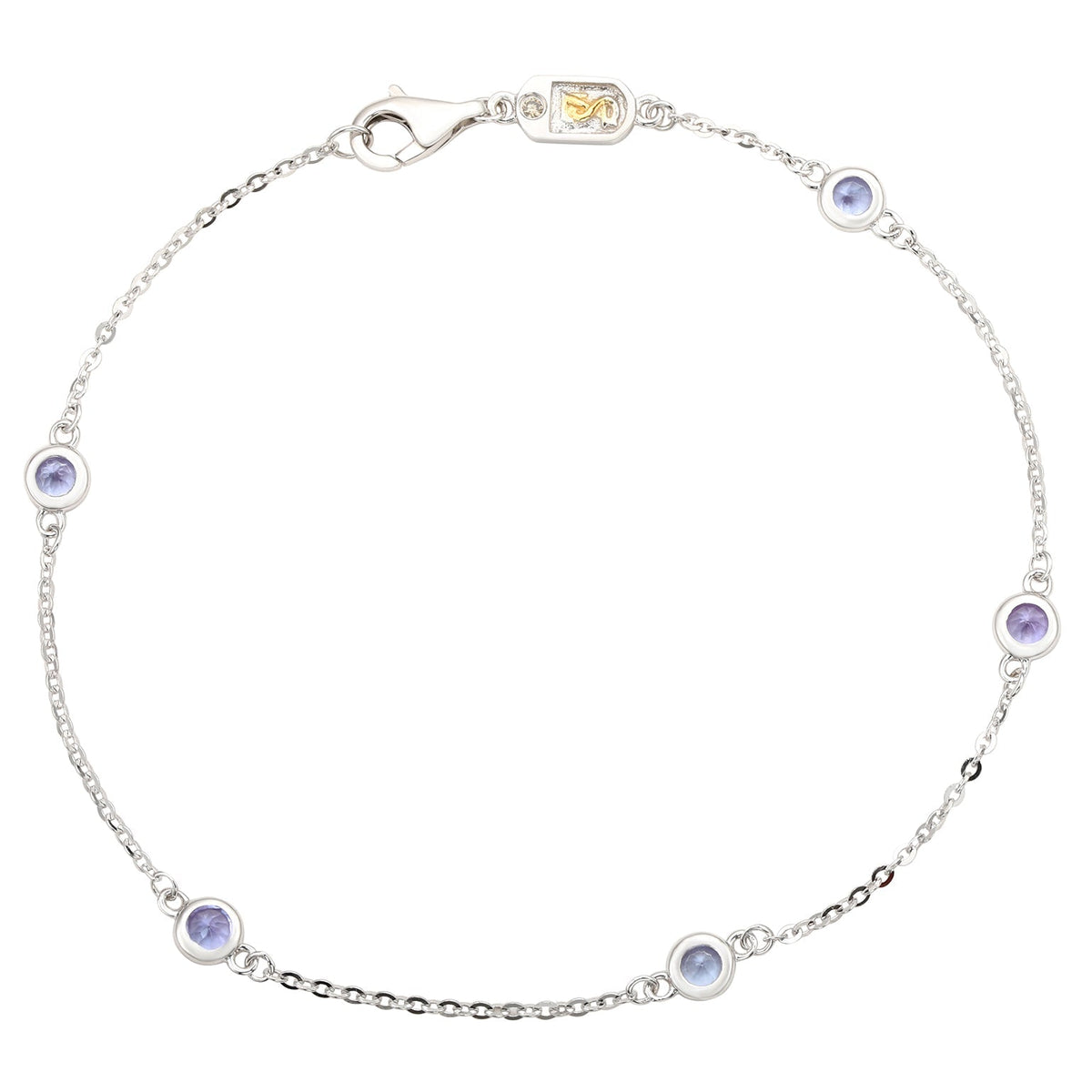 Crafted in 14K white gold, featuring 0.85 cttw of round-cut tanzanites (five stones). The bracelet measures 7 inches in length and is secured with a lobster clasp, with a plaque bearing the SL logo and hidden brown diamond.