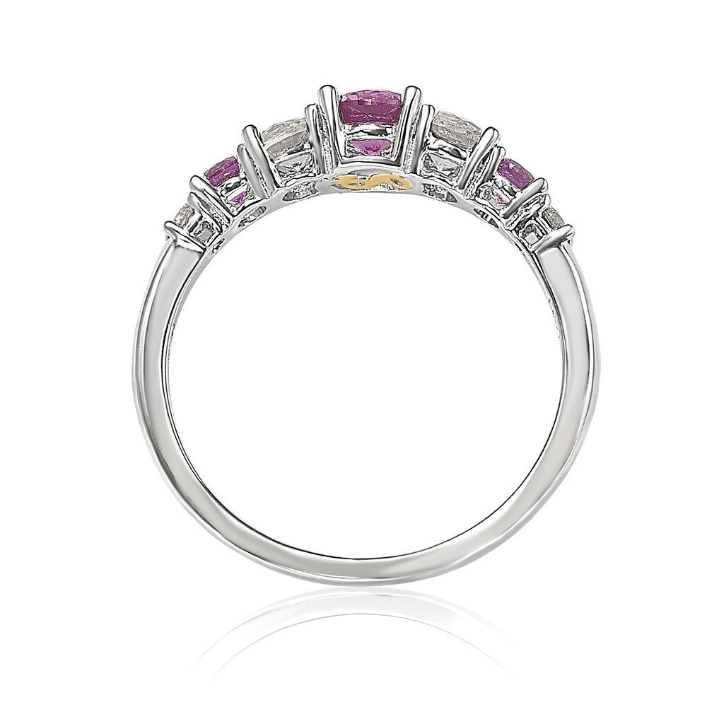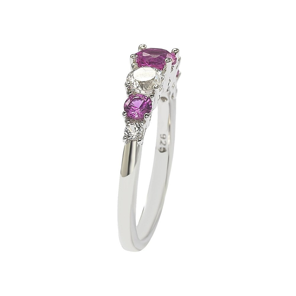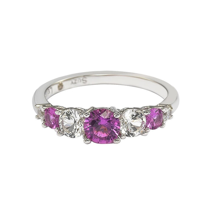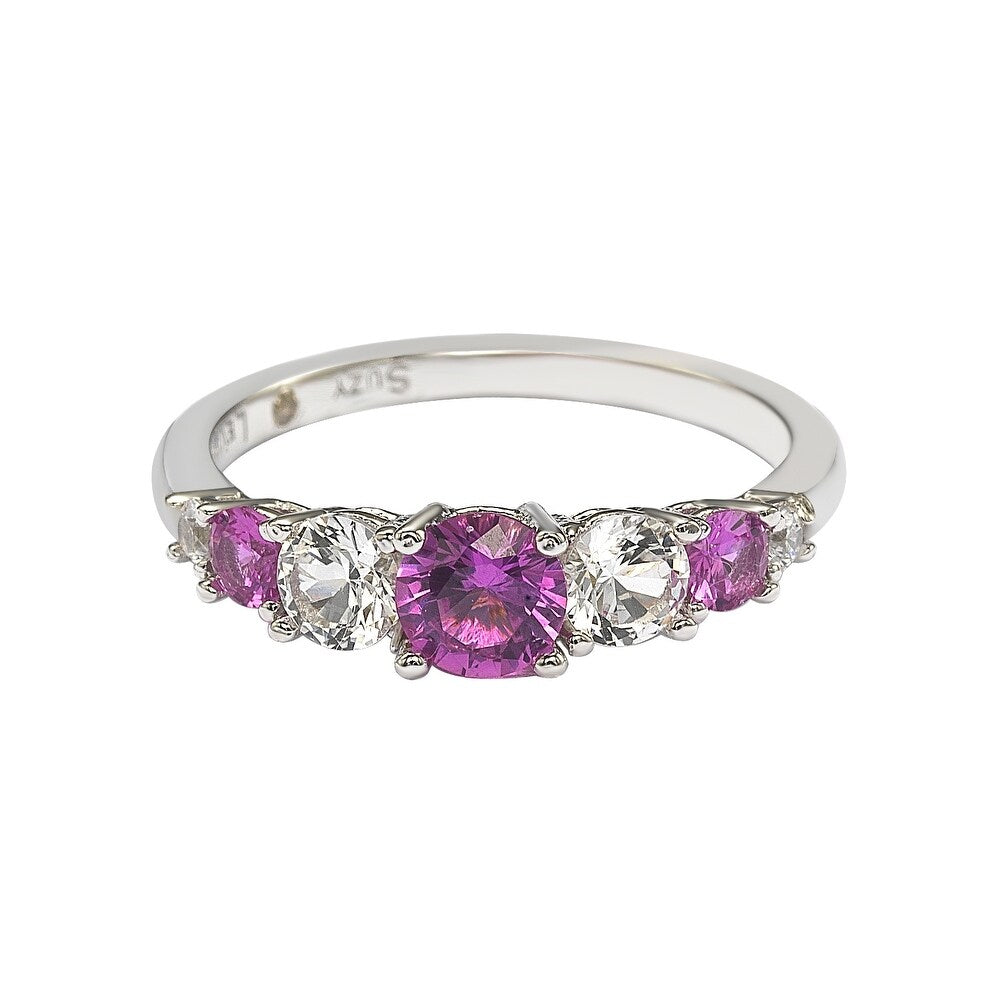 This Sterling Silver Pink Sapphire & Diamond Accent 1.75cttw 7-Stone Ring by Suzy Levian is a vibrant expression of love and commitment. The radiant pink sapphires and created white sapphires graduate from large to small, creating a dazzling effect. A hidden brown diamond in the shank symbolizes strength and empowerment, adding an emotional touch to this elegant design. Whether worn alone or stacked with other designs, this ring offers endless possibilities to express your love.