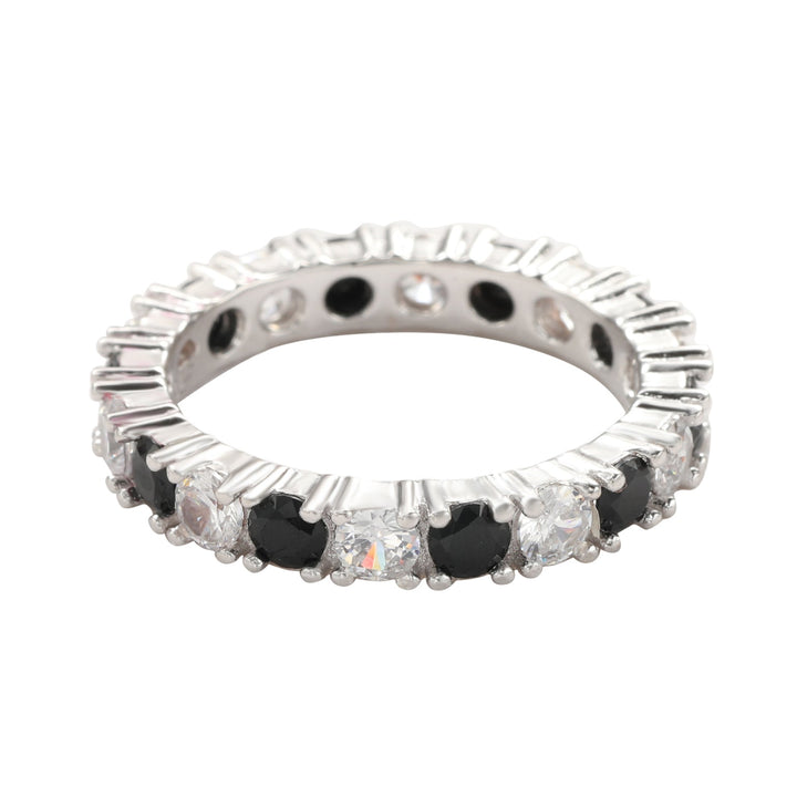 925 sterling silver with alternating black and white cubic zirconia stones. Eternity design with prong setting for durability and brilliance.