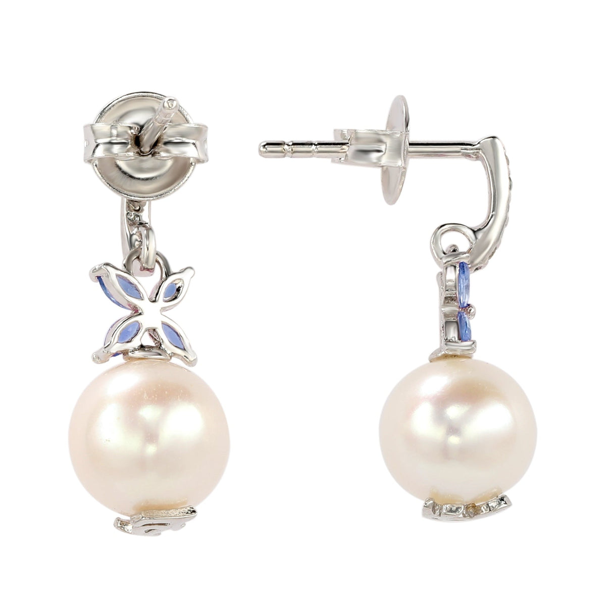 Crafted in sterling silver with 8mm white freshwater pearls and 4 marquise-cut blue sapphires. The earrings feature a high-polish finish and include a hidden gemstone for empowerment.