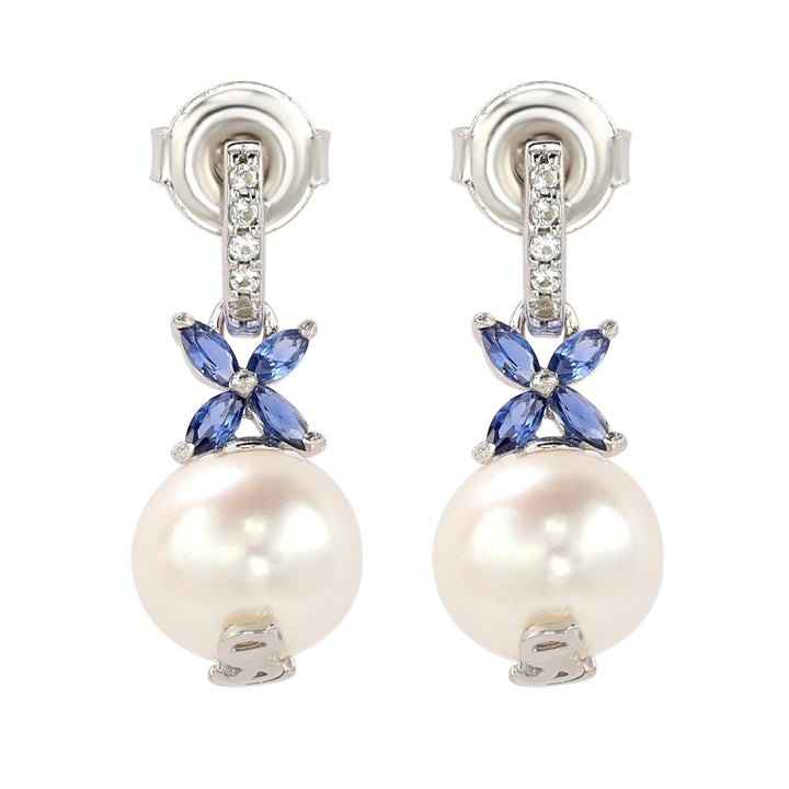 Suzy Levian Sterling Silver Pearl & Blue Sapphire Floral Earrings