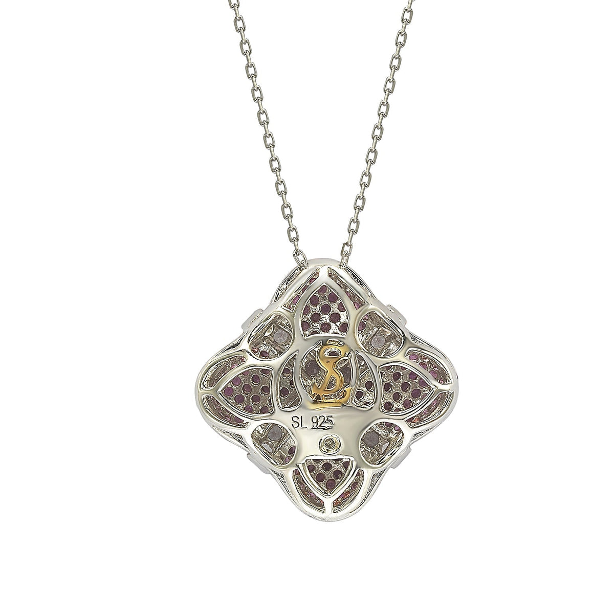 Crafted in 925 sterling silver with natural pink sapphires and created white sapphires. Features a hidden brown diamond (0.02 carats). Pendant dimensions: [specific dimensions].