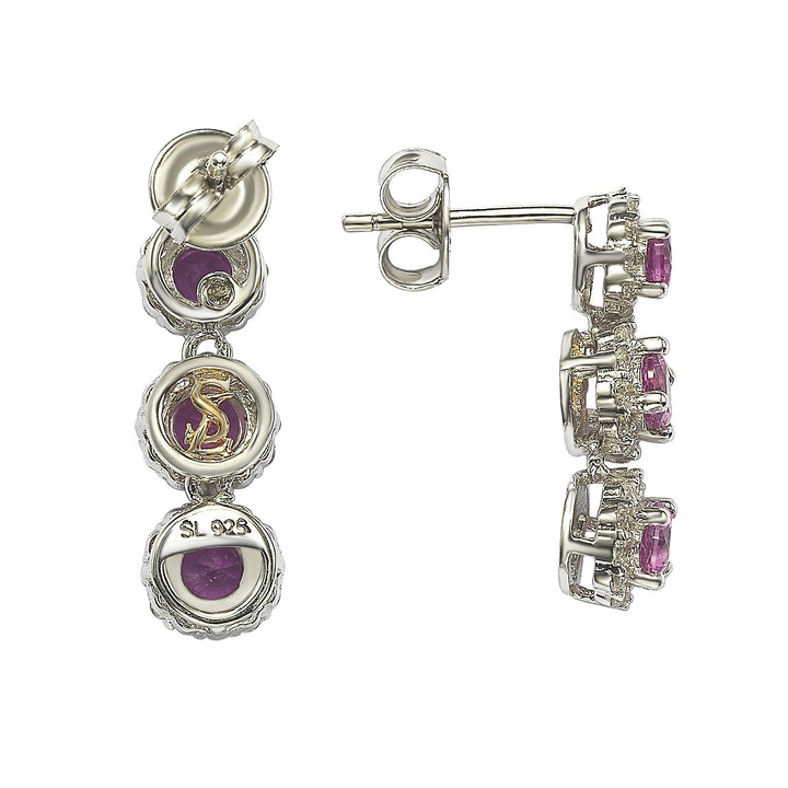 Handcrafted in sterling silver with three round-cut natural pink sapphires and pave-created white sapphires. Features a hidden brown diamond and a yellow-plated SL logo. Earrings dimensions: [specific dimensions]. Clasp type: Butterfly closure.