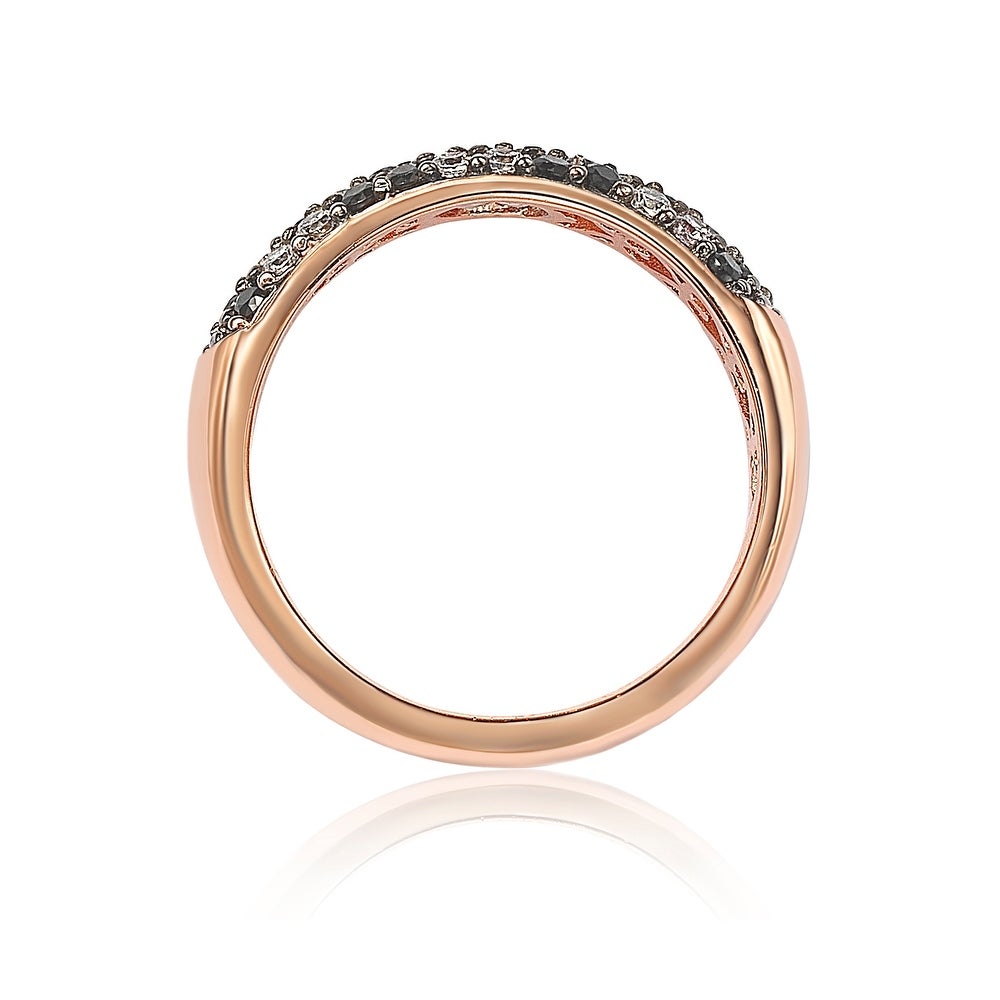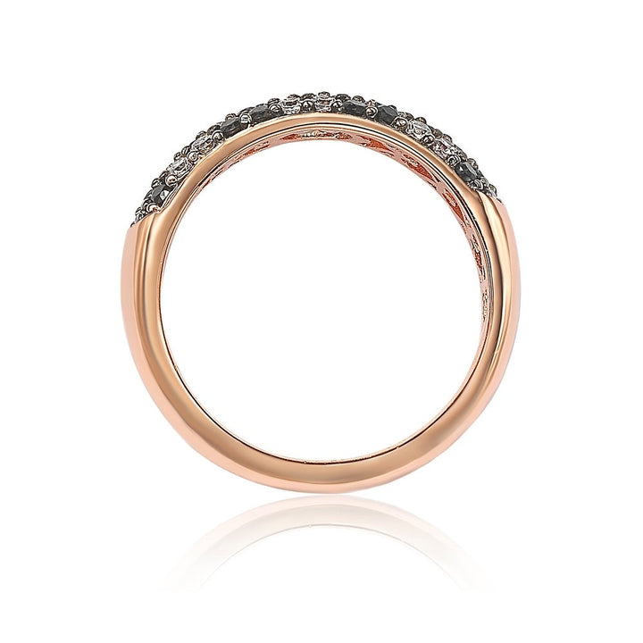 Crafted in rose sterling silver with black and white cubic zirconia stones. Flower design halfway down the band. High-polish finish.