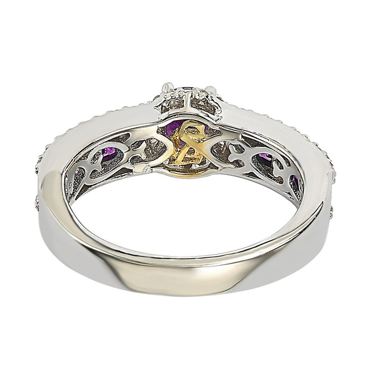 Crafted in sterling silver with a round-cut pink sapphire center stone and princess-cut pink sapphires. Pave-set created white sapphires on the band. Hidden .02ct diamond in the shank. Yellow gold-plated SL logo inside the gallery.