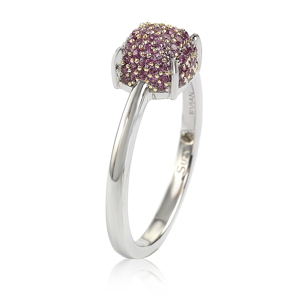 This Sterling Silver Pink Sapphire & Diamond Accent Pave Ball-Top Ring by Suzy Levian is a stunning piece from Suzy Levian's "Petite Perfects" collection, designed for women who appreciate a slimmed-down yet impactful style. The ring features a cluster of natural pink sapphires arranged in a ball-top design, complemented by diamond accents. The hidden diamond (.02ct) set in the shank symbolizes inner strength, power, and beauty, empowering the wearer. Crafted in sterling silver with a golden SL logo on the undergallery, this ring combines sophistication with Suzy Levian’s unique message of self-empowerment.
