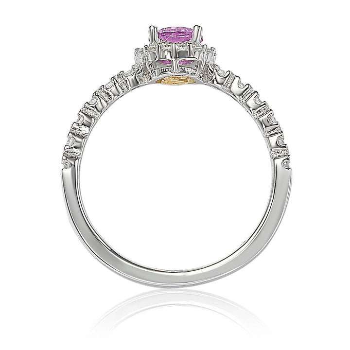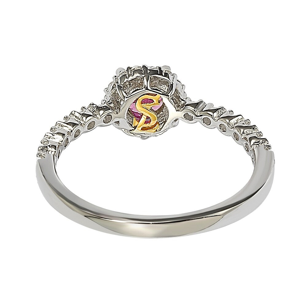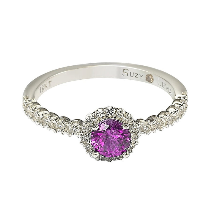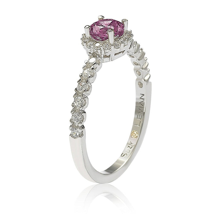 This Suzy Levian Sterling Silver Pink Sapphire (0.54cttw) & Diamond Accent Petite Bridal Ring combines elegance and meaning. Featuring a round cut pink sapphire center stone, surrounded by a white sapphire pave-set halo, the design continues down the band, offering a slim, delicate profile. This ring also includes a hidden .02ct diamond in the shank, symbolizing empowerment. A closed undergallery with an 18k yellow gold SL logo further emphasizes the brand's signature.