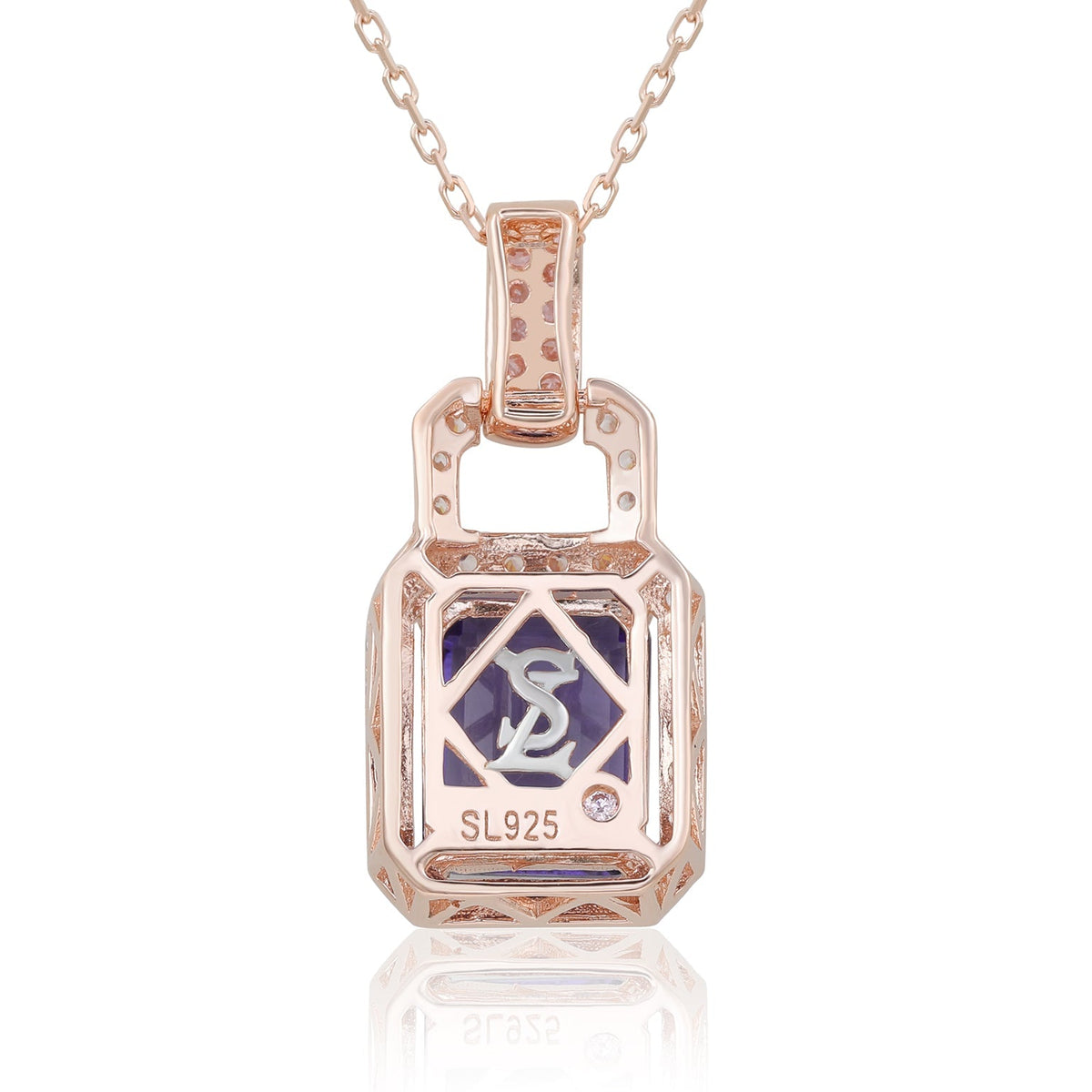 Rose-plated sterling silver with emerald-cut blue tanzanite cubic zirconia and pink & white cubic zirconia. Hidden .02ct diamond on the back. 18' cable chain with spring ring clasp.