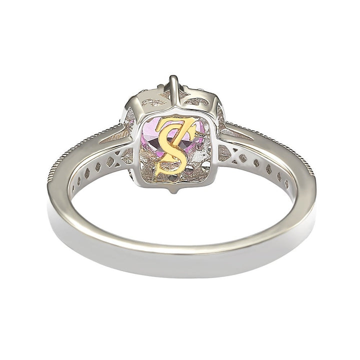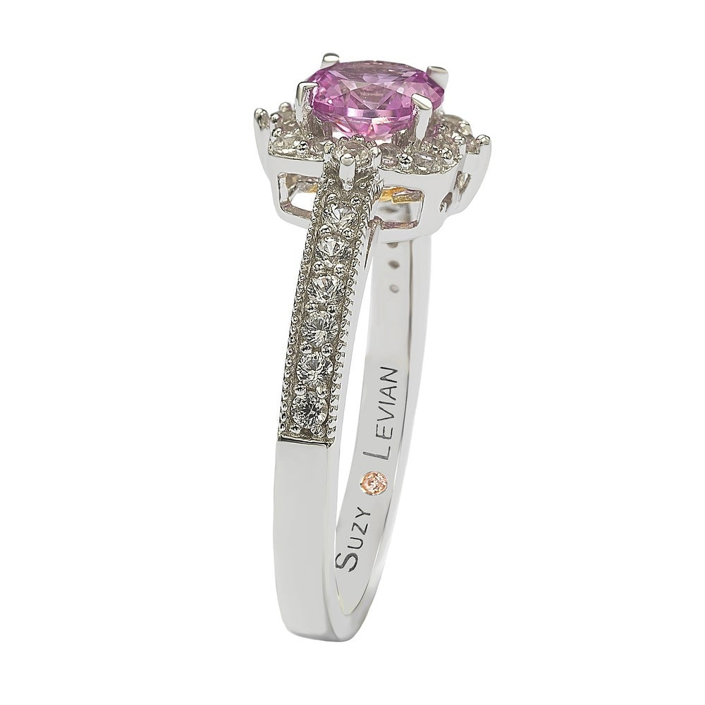 This Suzy Levian Sterling Silver Pink Sapphire & Diamond Accent Center Stone Ring is a stunning piece that combines elegance with a touch of whimsy. The center features a round-cut natural pink sapphire, surrounded by a cushion-shaped halo of sparkling white sapphires, creating a beautiful contrast. Handcrafted in sterling silver, the ring also includes a hidden signature diamond (.02ct) set in the shank, reflecting Suzy Levian’s commitment to empowering women. The closed undergallery and the golden SL logo further emphasize the craftsmanship behind this timeless design.