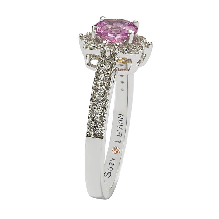 Crafted in sterling silver. Features a round-cut natural pink sapphire, white created sapphires, and a .02ct hidden diamond. The undergallery is engraved with the Suzy Levian SL logo.