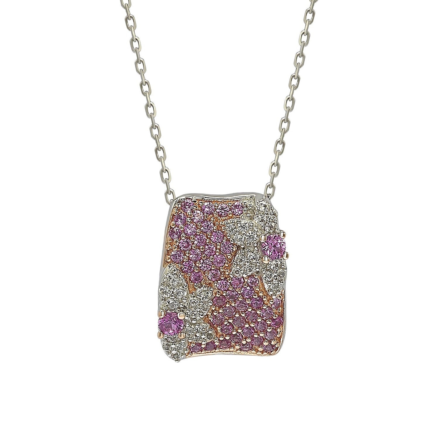Crafted in 925 sterling silver with natural pink sapphires and created white sapphires, including a hidden 0.02 ct brown diamond. Finished with a two-tone setting and 18k solid yellow gold accents. Pendant dimensions: 11.5mm x 15mm. Chain length: 18 inches.