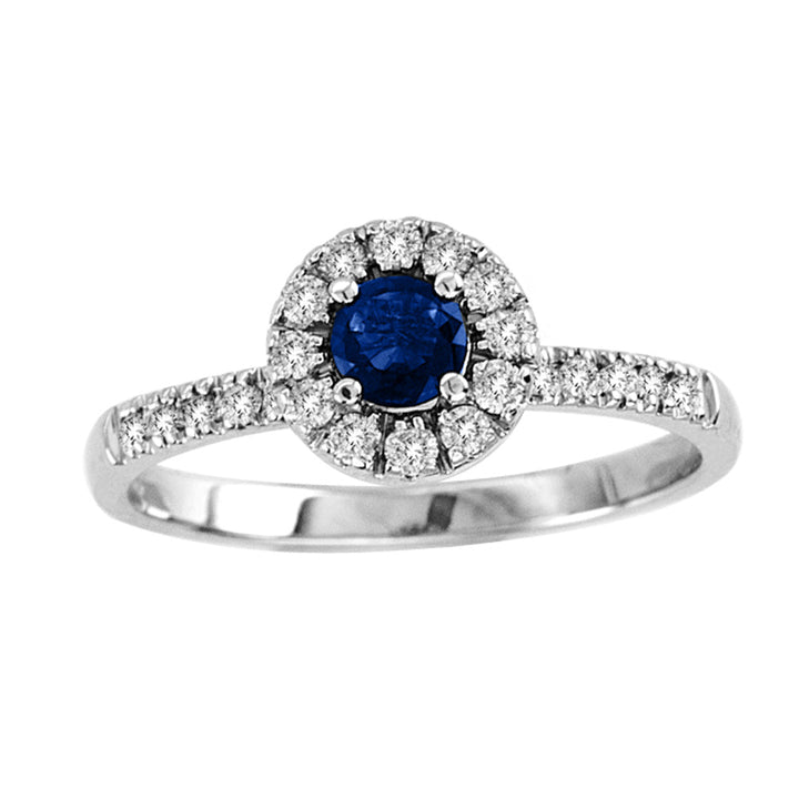 Crafted in 14k white gold. Blue sapphire: 1/3 carat, round-cut. White diamonds: 1/3 carat total weight, round-cut, H-I color, I1-I2 clarity. Setting: prong. Finish: high polish.