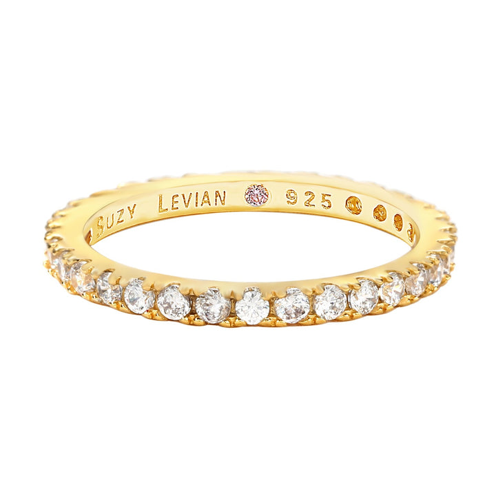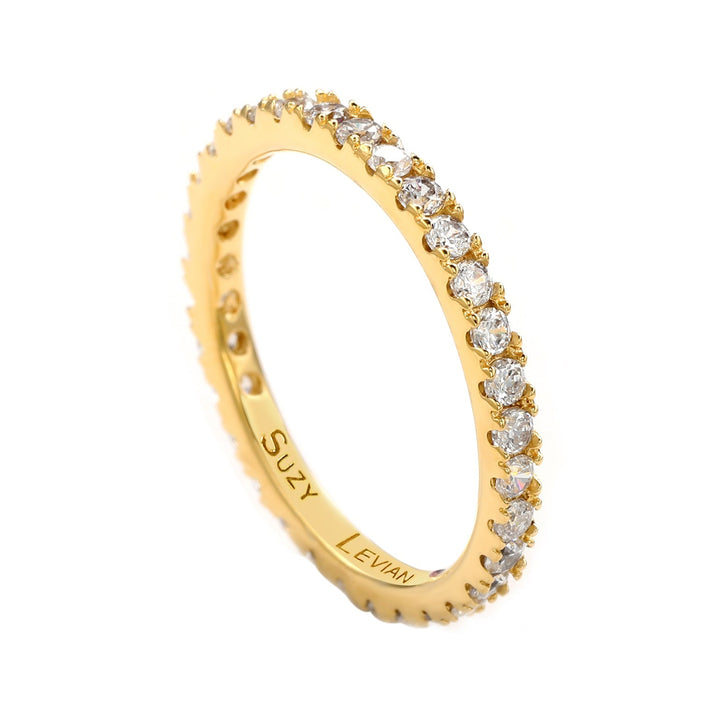 Crafted in yellow sterling silver, featuring round-cut white cubic zirconia stones. 2mm band width. Sturdy prong setting for durability. Includes Suzy Levian’s hidden signature stone.