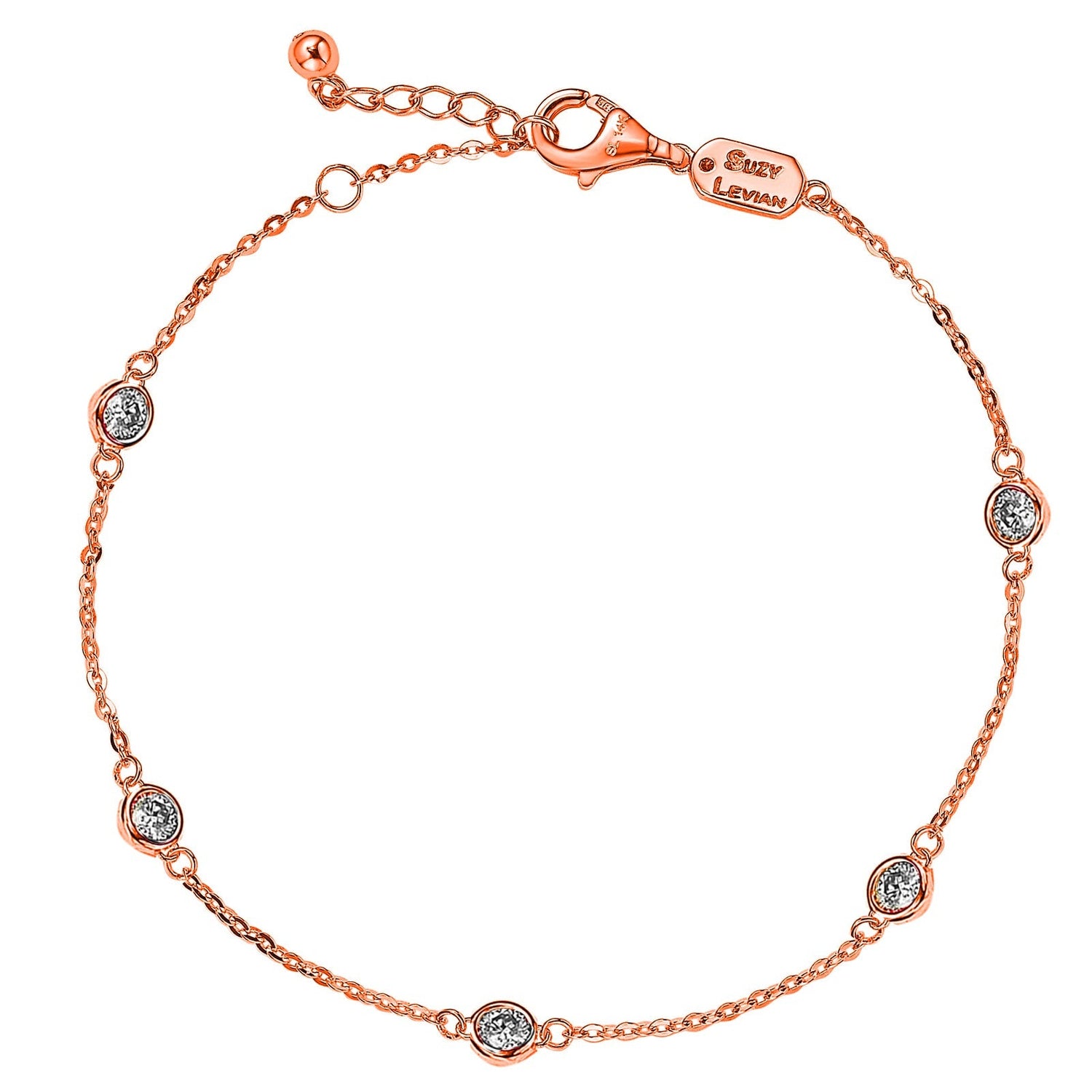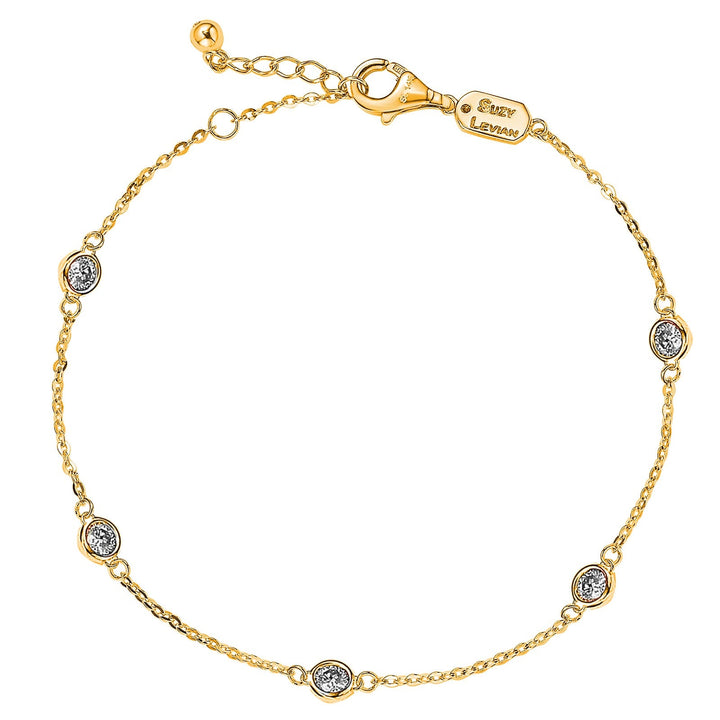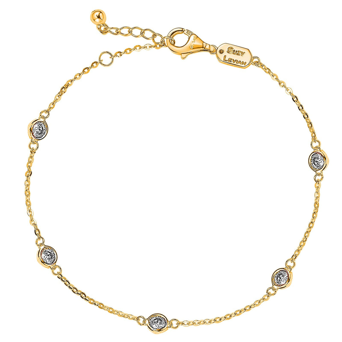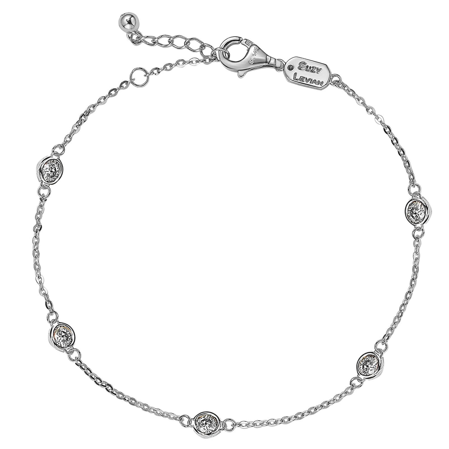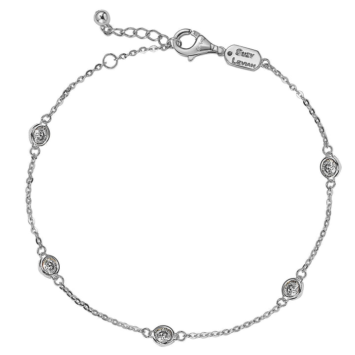 This Suzy Levian 0.75 ct TDW Diamond Station Bracelet is a luxurious statement piece, blending classic elegance with contemporary sophistication. Set in 14k white gold, this delicate yet radiant bracelet features five brilliant round-cut diamonds, each bezel-set for maximum sparkle. The adjustable length ensures a perfect fit, making it a timeless addition to any jewelry collection.