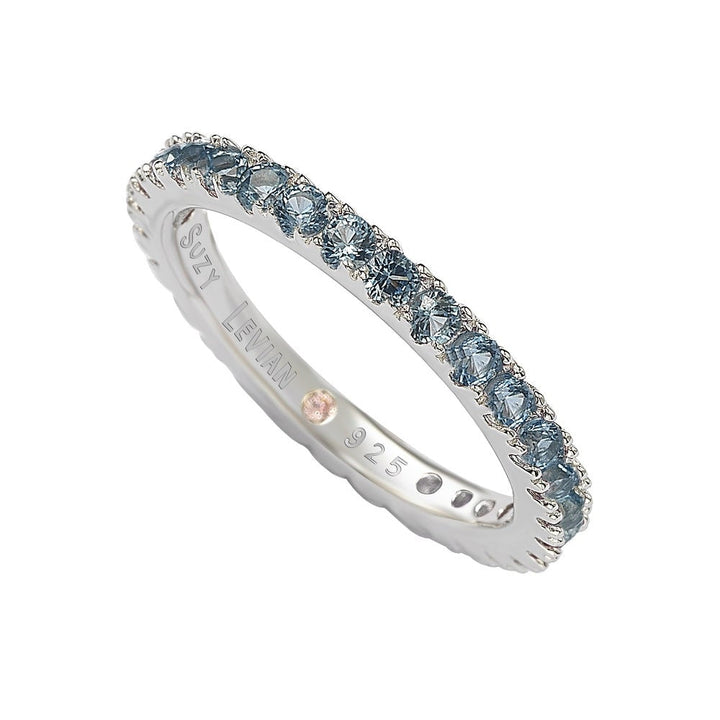 Expertly crafted in sterling silver, adorned with round-cut aqua cubic zirconia stones. 2mm width eternity band design. Secure prong setting for lasting brilliance. Suzy Levian’s signature hidden CZ stone for empowerment. High-polish finish for a sleek, refined look.