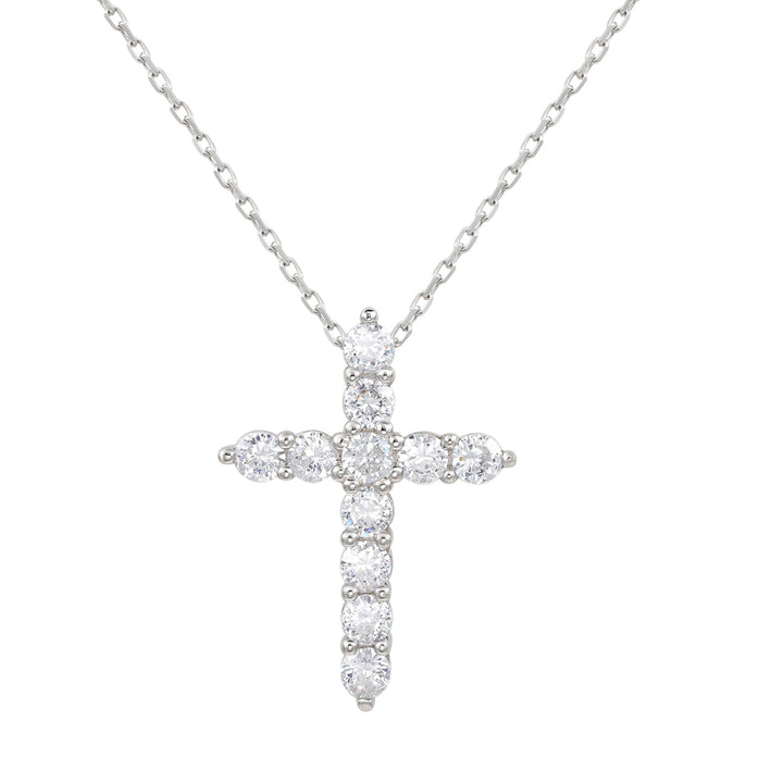 This Suzy Levian White Sterling Silver Cubic Zirconia Cross Pendant is rich in spiritual significance and style. The simple yet striking cross silhouette is adorned with round-cut white cubic zirconia, emitting a delightful sparkle. Suspended from an 18-inch cable chain, this piece is crafted in iconic 925 sterling silver. Designed by Suzy Levian, it also features a hidden stone inside the pendant to inspire strength and beauty. Perfect for layering or as a meaningful standalone piece.