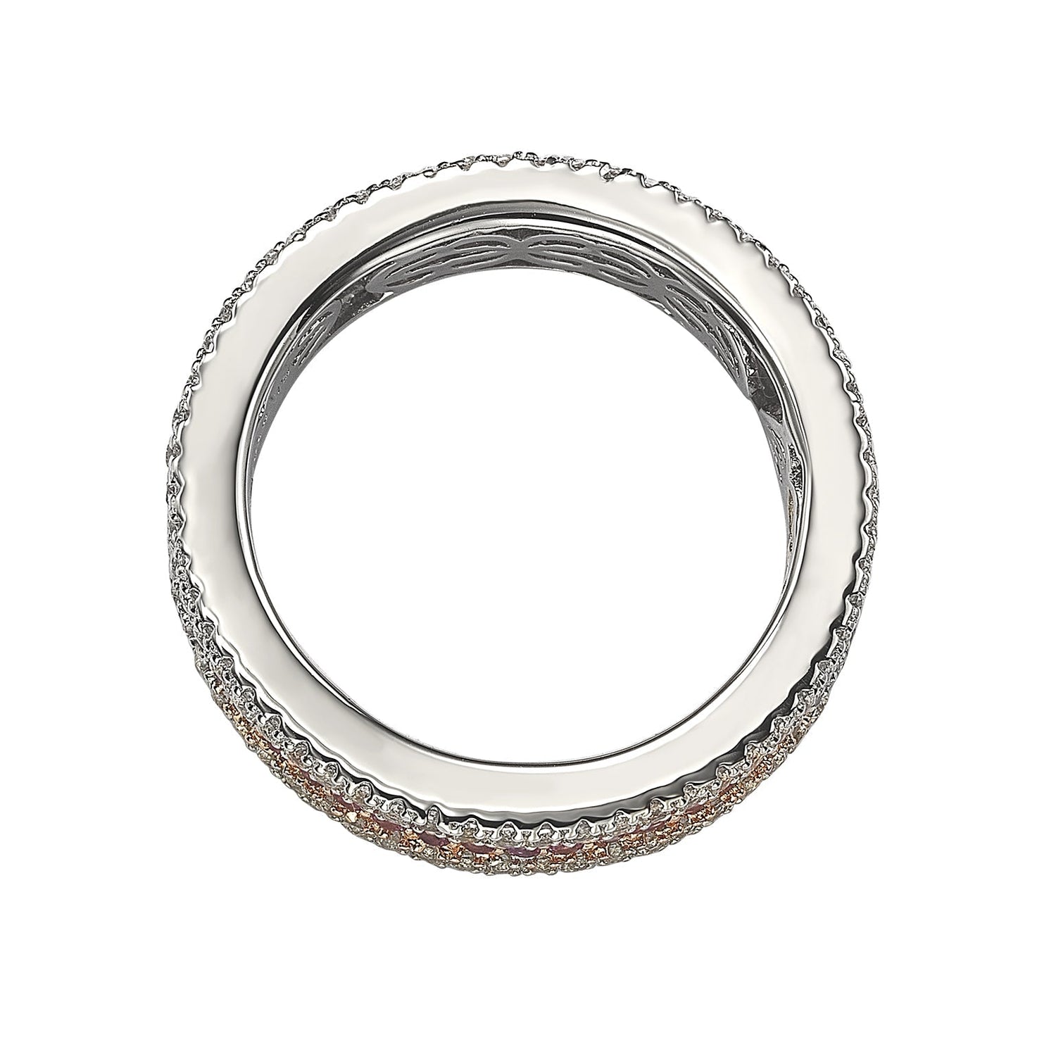 Crafted in sterling silver, featuring pink sapphire and created white sapphire pave setting. Includes a hidden brown diamond in the shank. Finished with a closed under-gallery for comfort.