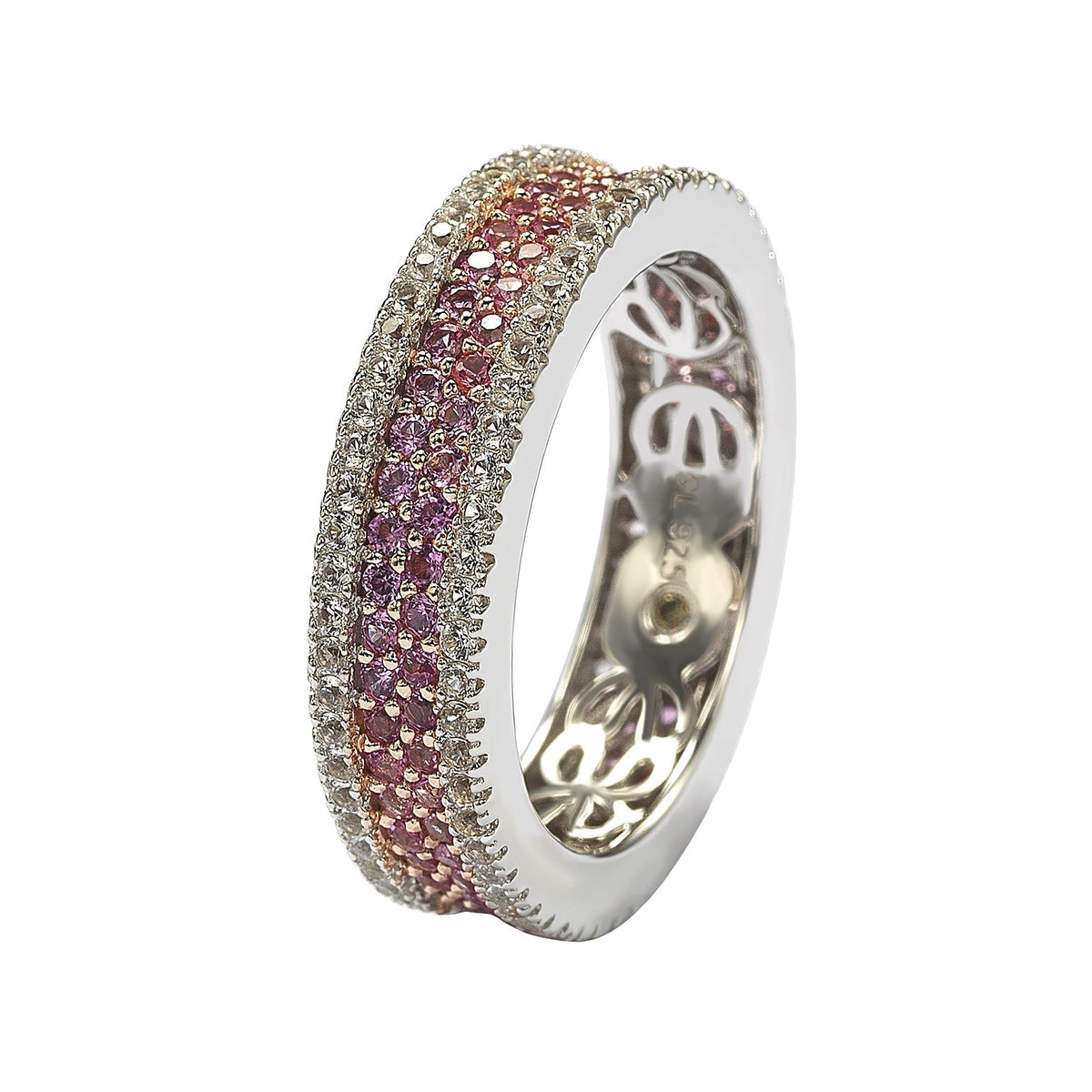 This Pink Sapphire and Diamond Accent Pave Eternity Band by Suzy Levian is a dazzling fusion of color and brilliance. Featuring two rows of vivid pink sapphire gemstones, framed by created white sapphire accents, this ring radiates a bold and elegant appeal. The sterling silver setting with a two-tone finish enhances the vibrancy of the stones, while Suzy Levian’s signature hidden brown diamond in the shank symbolizes strength and empowerment.