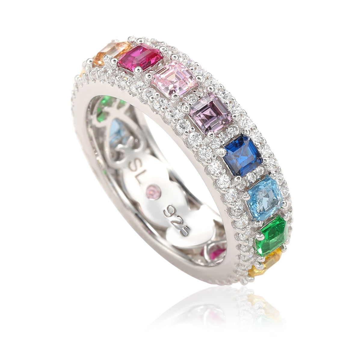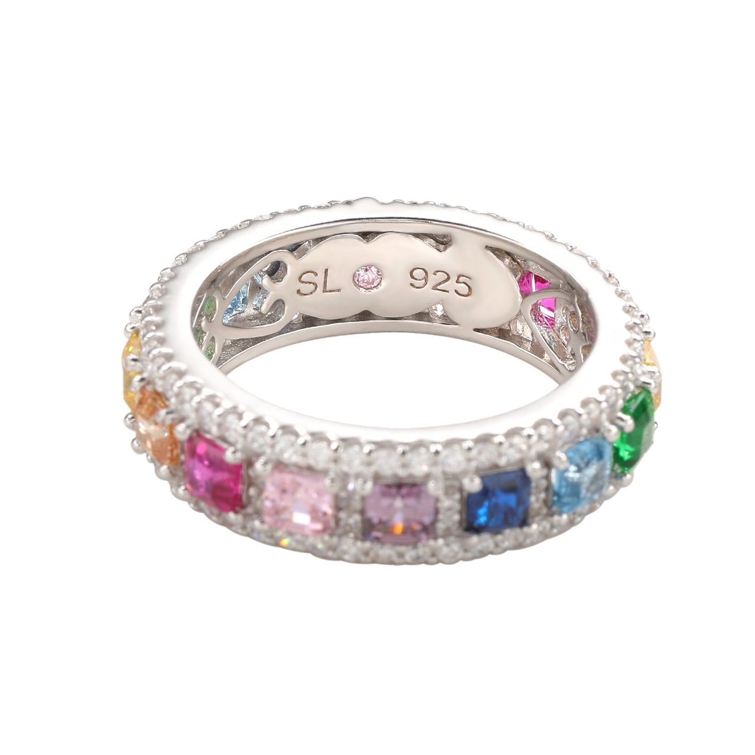 This Suzy Levian Sterling Silver Rainbow Cubic Zirconia Modern Eternity Band is a vibrant and contemporary take on the classic eternity ring. A dazzling array of Asscher-cut multicolor cubic zirconia is prong-set between two rows of brilliant white pave cubic zirconia, creating a mesmerizing spectrum of color. Designed for lasting beauty, this ring symbolizes love and eternity, making it a perfect gift for anniversaries or meaningful milestones. A hidden gemstone in the shank and Suzy Levian's SL logo add a signature touch, reinforcing the message of strength and empowerment.