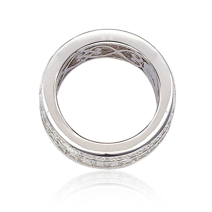 This Sterling Silver Cubic Zirconia White Baguette Modern Eternity Band by Suzy Levian is a luxurious and timeless piece designed to symbolize everlasting love. The band features a series of white round and baguette-cut cubic zirconia gemstones set in high-polish sterling silver. The two-tone design adds a modern twist, while the hidden gemstone in the shank represents inner strength and beauty.
