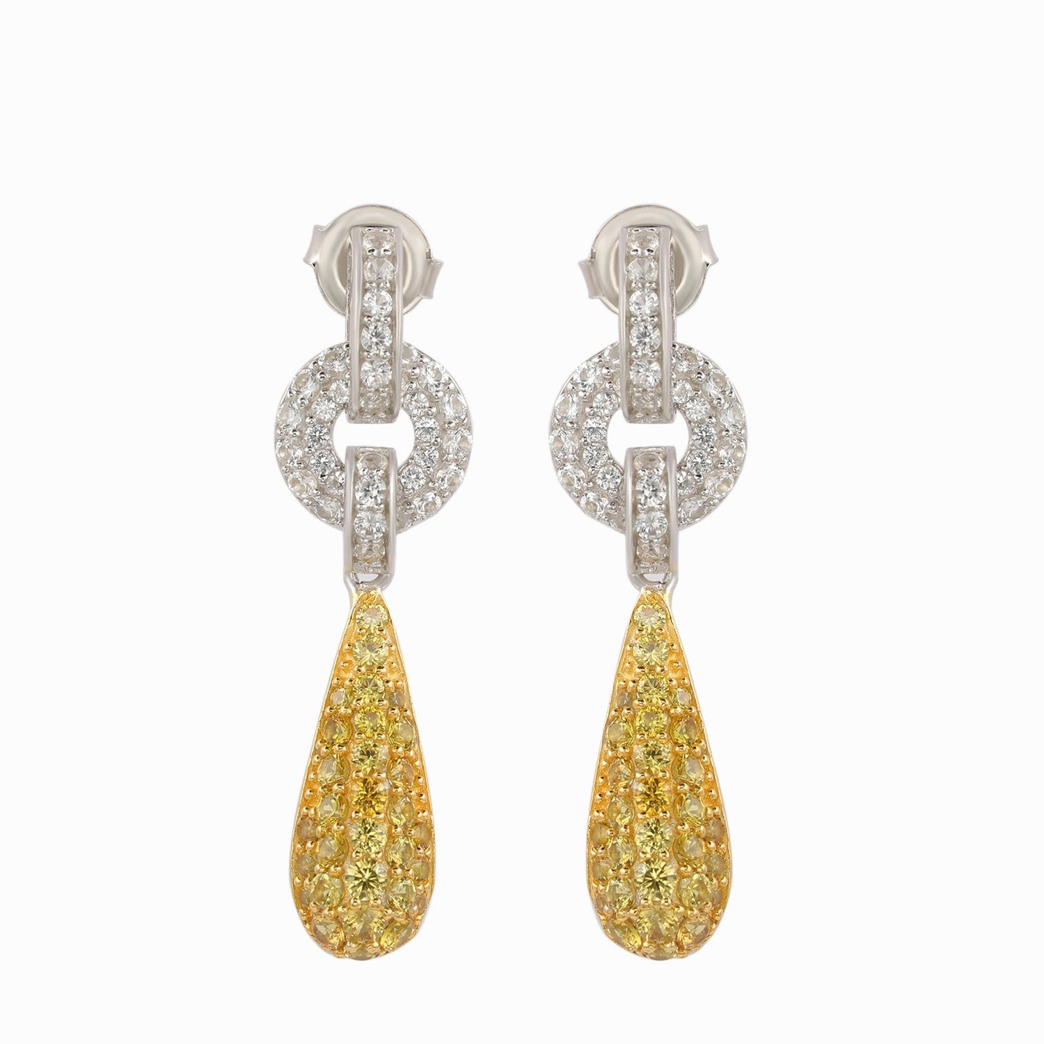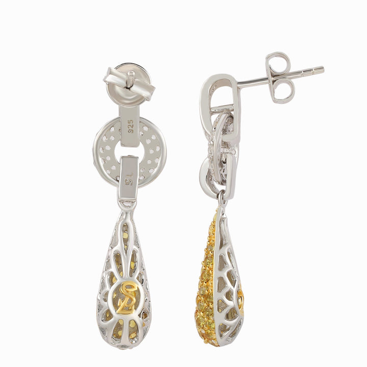 These Suzy Levian Sterling Silver Yellow Sapphire and Diamond Accent Tear Drop Dangle Earrings bring a bold and vibrant touch to any look. Featuring 120 pave-set round-cut yellow sapphires, created white sapphires, and a hidden brown diamond, these earrings are a work of art. The tear drop design is both striking and elegant, making these earrings perfect for an evening out or a special occasion.