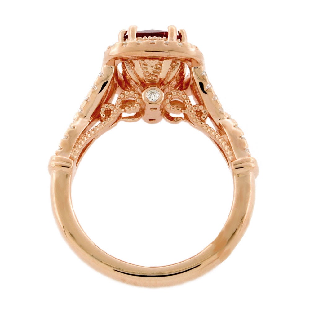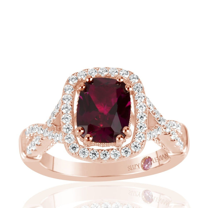 Handcrafted in rose sterling silver with a 12mm elongated cushion-cut created ruby and pave white cubic zirconia halo. The ring features a hidden stone in the shank. The band is designed with a crossover 'X' design.