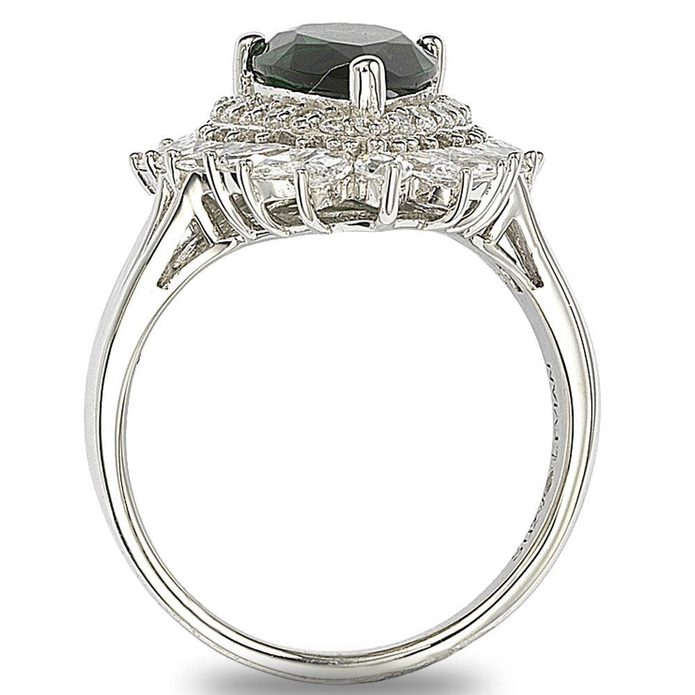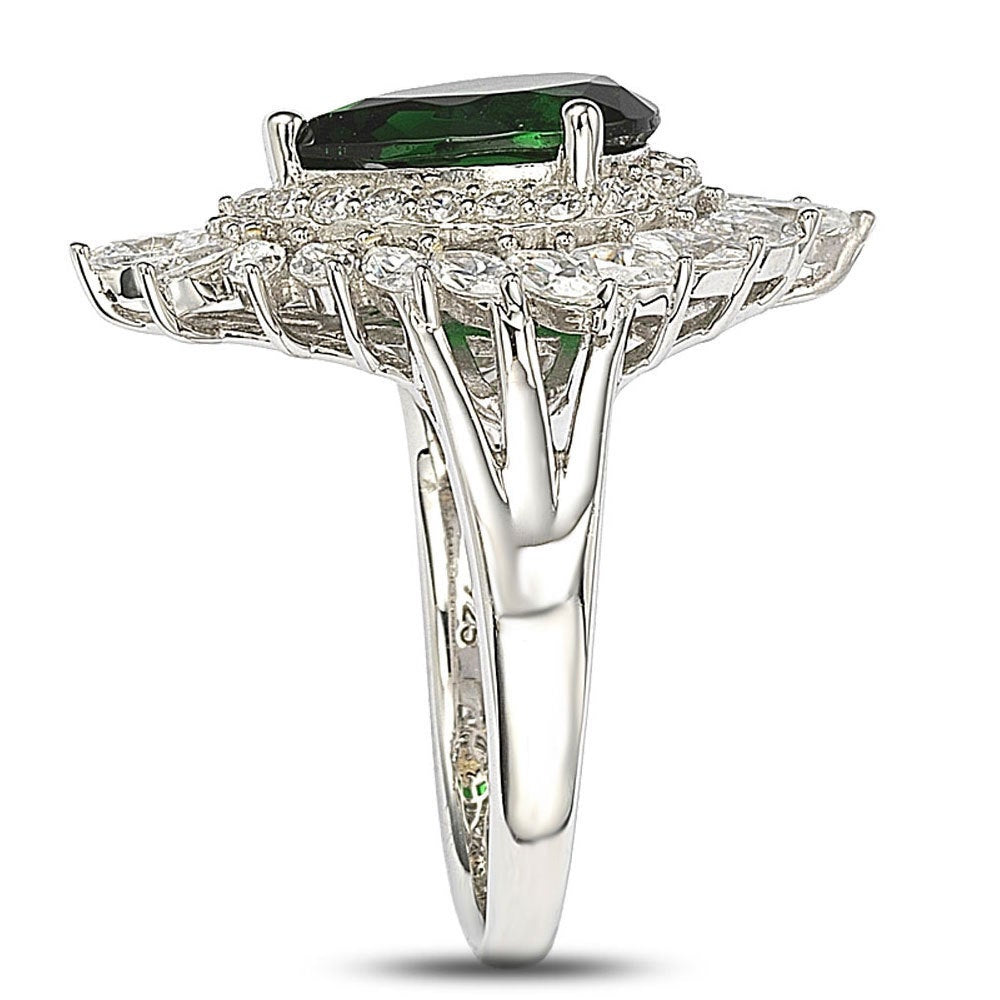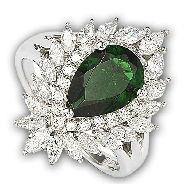 The Suzy Levian Sterling Silver and 18K Gold Simulated Emerald Ring is a regal masterpiece inspired by timeless glamour. A pear-cut green cubic zirconia is set in sterling silver and surrounded by white round-cut stones, creating an opulent halo effect. A hidden cubic zirconia in the shank adds a meaningful touch, representing inner strength and beauty.