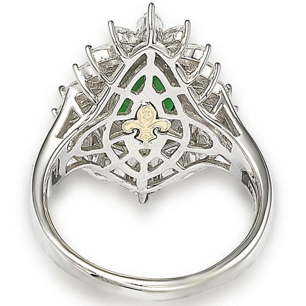 Crafted in sterling silver with an 18K gold logo. Features a pear-cut simulated emerald surrounded by cubic zirconia. Finished with a comfort-fit closed under-gallery.