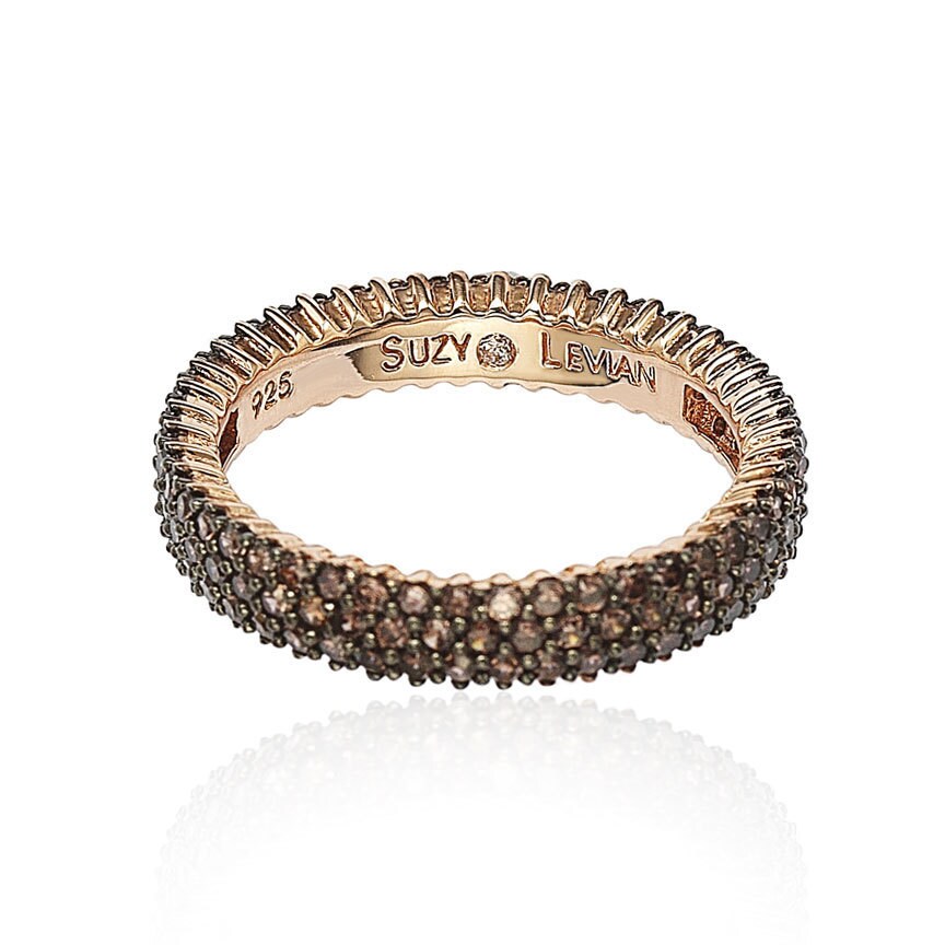 This Rose Sterling Silver Micro-Pavé Brown Cubic Zirconia Eternity Band by Suzy Levian is an exquisite symbol of everlasting beauty. Set with 130 hand-placed round-cut brown cubic zirconia stones, this band delivers a rich and warm sparkle. The rose-plated sterling silver enhances the vintage aesthetic, making it a fashion-forward yet timeless piece. Featuring Suzy Levian’s hidden signature gemstone, this ring is designed to empower and inspire. An ideal gift for special occasions or self-indulgence.