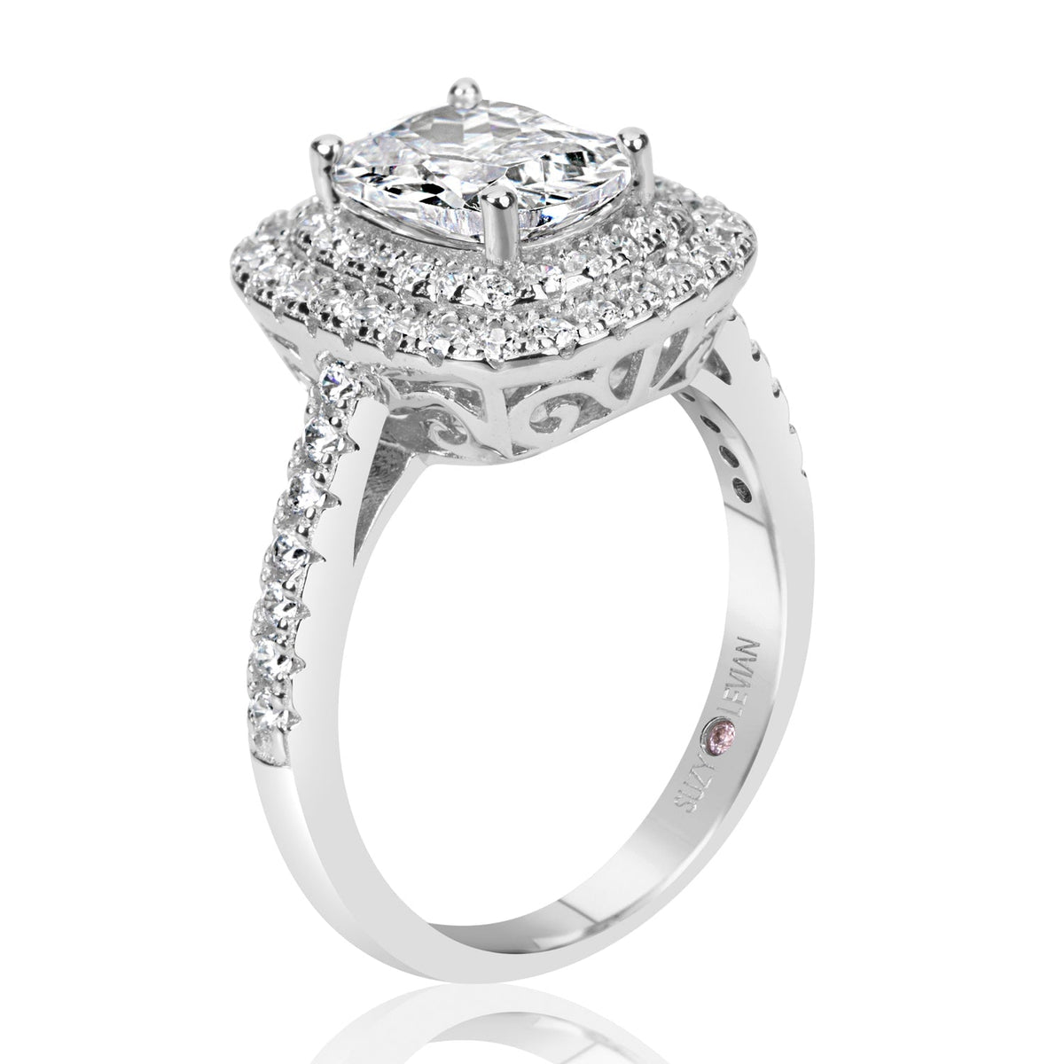 Handcrafted in sterling silver, this bridal ring features a cushion-cut white cubic zirconia surrounded by two pavé halos. A hidden pink cubic zirconia is set in the shank. The ring has a closed under-gallery for comfort fit. Stone treatment: N.