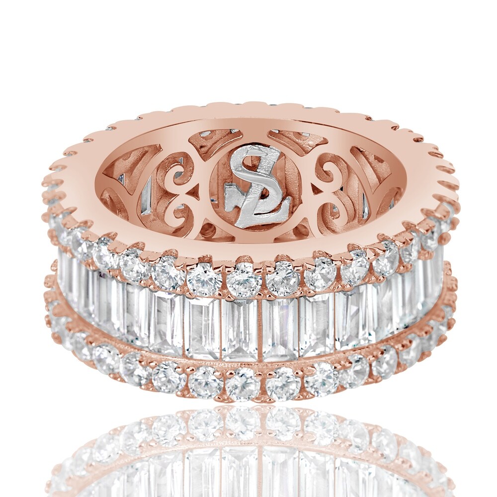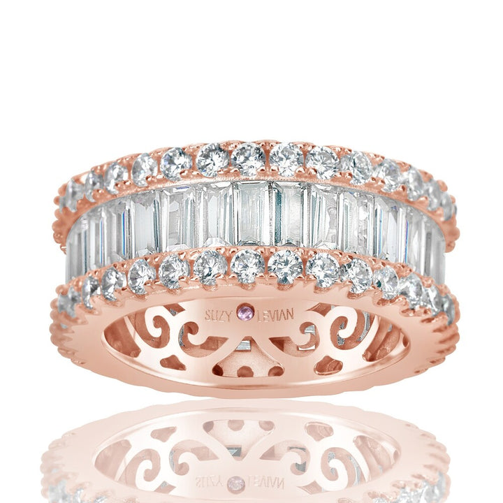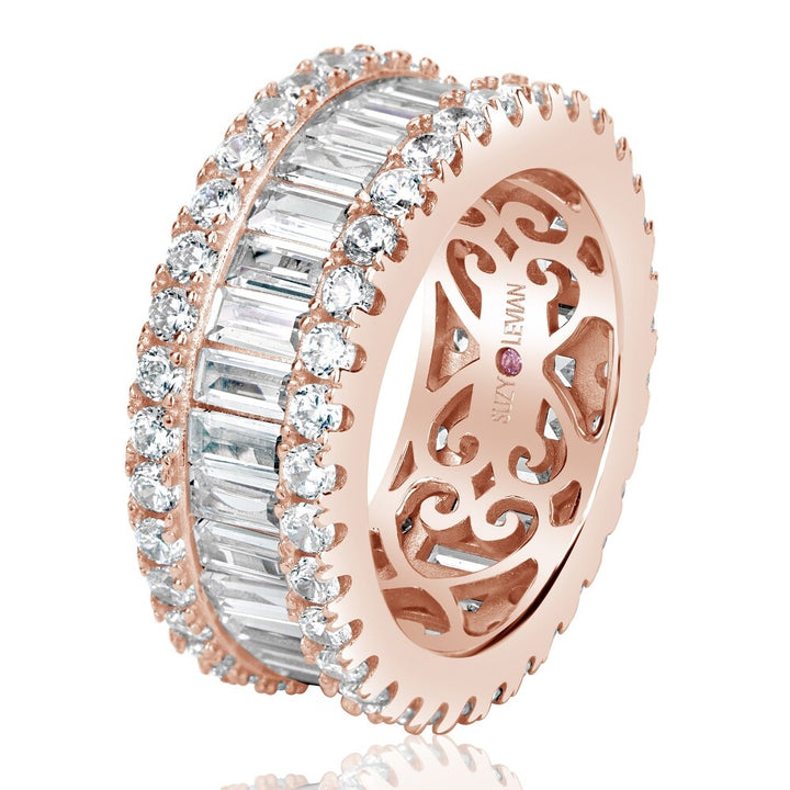 This Suzy Levian Rose Sterling Silver Cubic Zirconia White Baguette and Round Wide Eternity Band symbolizes eternal love and sophistication. Designed with precision, this wide eternity band features both round and baguette white cubic zirconia, channel-set between two rows of round prong-set stones. The high-polish rose sterling silver setting complements the shimmering stones beautifully, making it a perfect anniversary or engagement ring. With a hidden gemstone in the shank, it also empowers the wearer to embrace their inner strength.