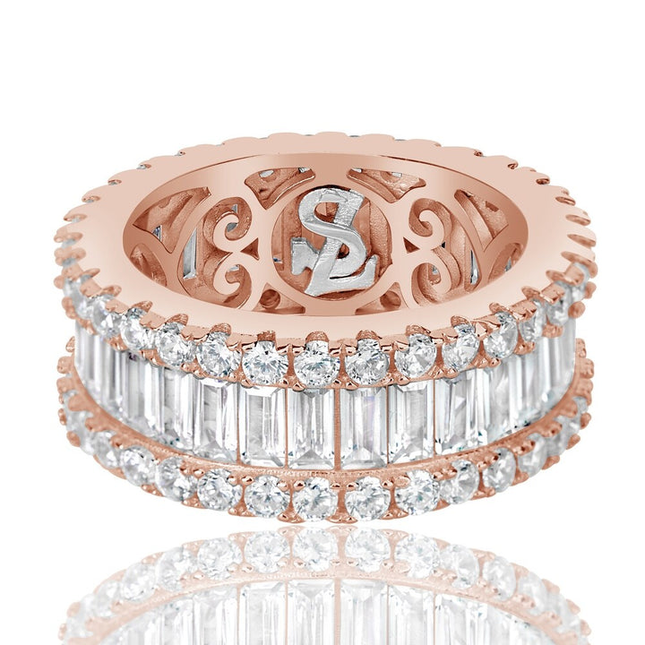 Crafted in rose sterling silver with white cubic zirconia (round and baguette cuts). Band width: 10mm.