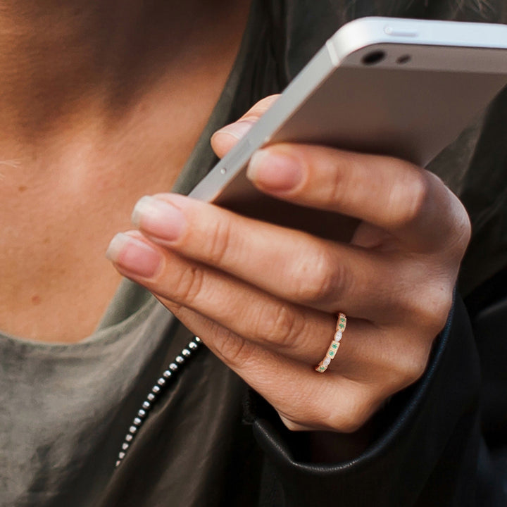 This Emerald and Diamond Semi-Eternity Ring by Mimi & Max is a classic yet colorful take on timeless elegance. Showcasing six pave-set emerald gemstones arranged in a rectangular shape, accented by eight sparkling round-cut diamonds, this ring is a radiant celebration of love and sophistication. The high-polish 10k yellow gold setting and intricate milgrain detailing add vintage charm, making it a perfect anniversary or wedding band.