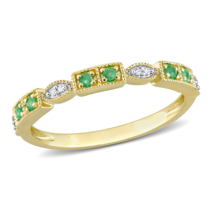 Crafted in 10k yellow gold, featuring 1/8 ct. t.w. round-cut emeralds (H-treated) and eight round-cut diamonds (0.024 ct. t.w.) in G-H color, I1-I2 clarity. Pave setting with textured finish. Metal weight: 1.87 grams.