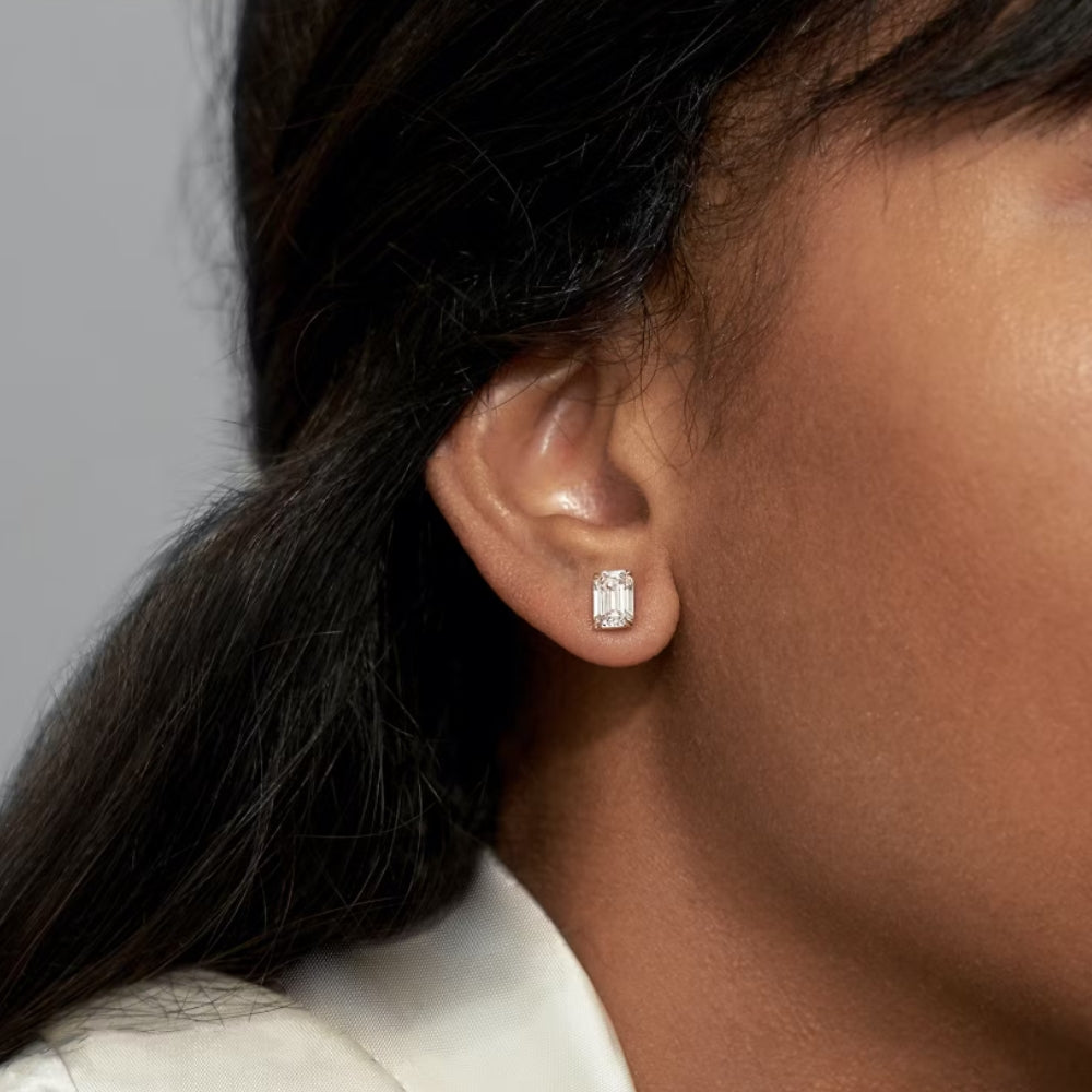 These 2 1/4 Ct Lab Grown Emerald Cut Diamond Studs by Pompeii3 are a timeless addition to any jewelry collection. The sleek emerald-cut diamonds radiate elegance, while the prong settings enhance their brilliance. These stud earrings convey strength and sophistication, making them perfect for both everyday wear and special occasions. The simplicity of their design allows them to be paired effortlessly with other jewelry.