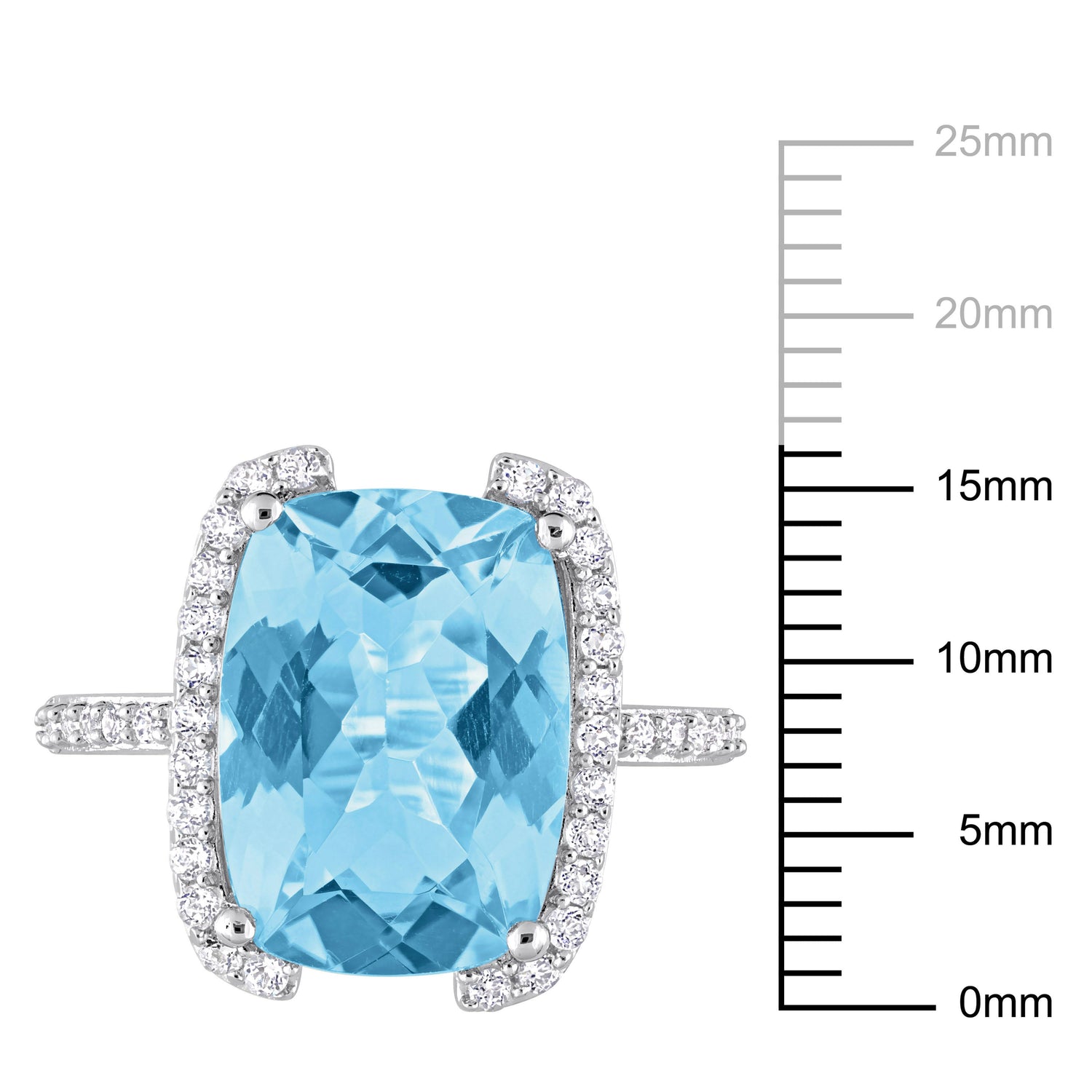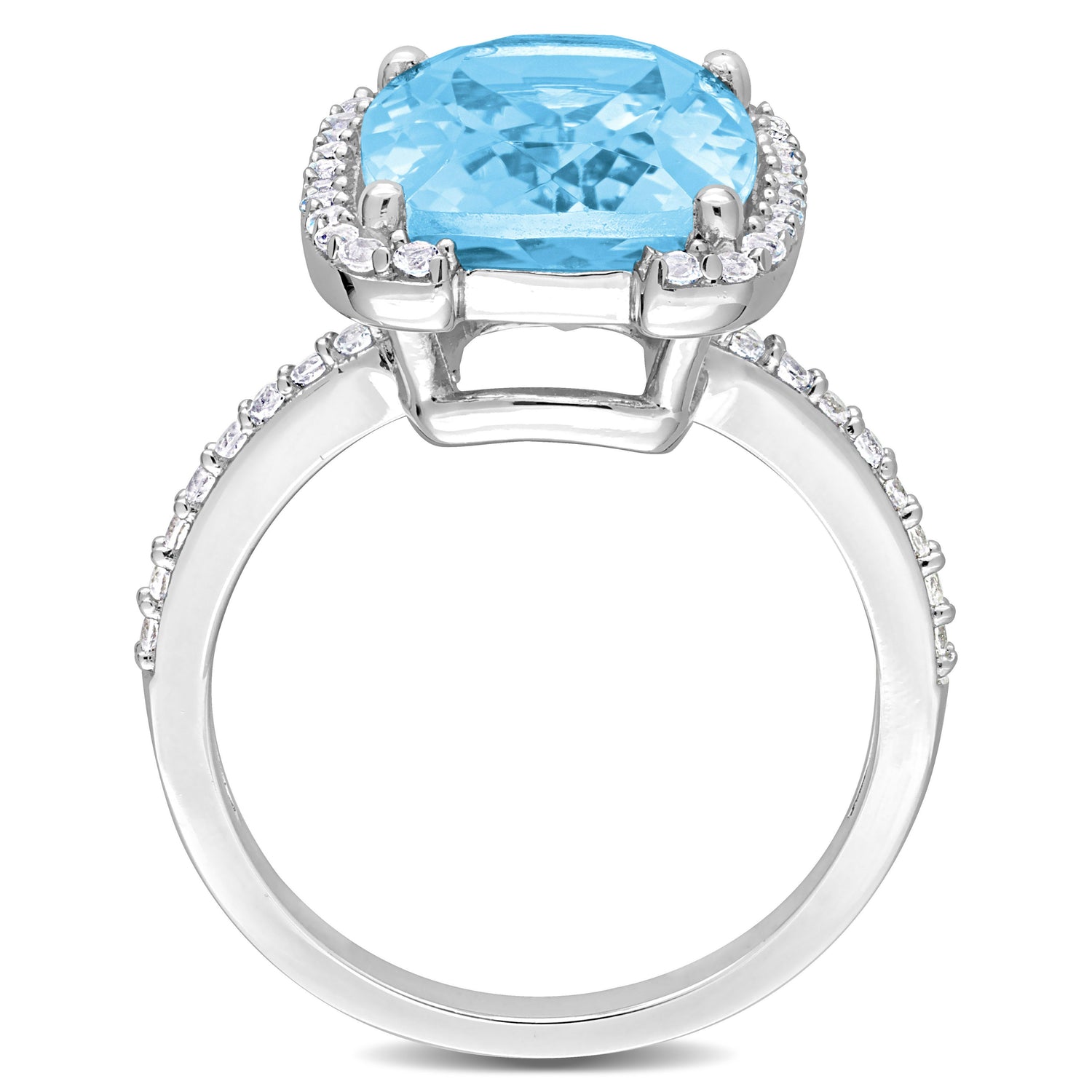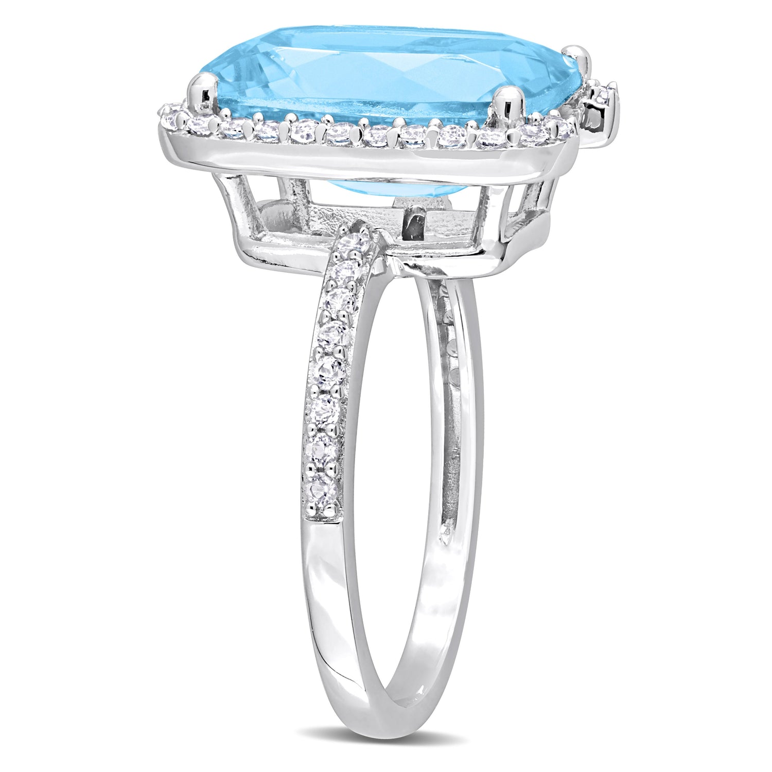 Crafted in sterling silver with a high-polish finish. Features a 9.4ct cushion-cut sky-blue topaz and white topaz accents totaling approximately 0.25 carats.