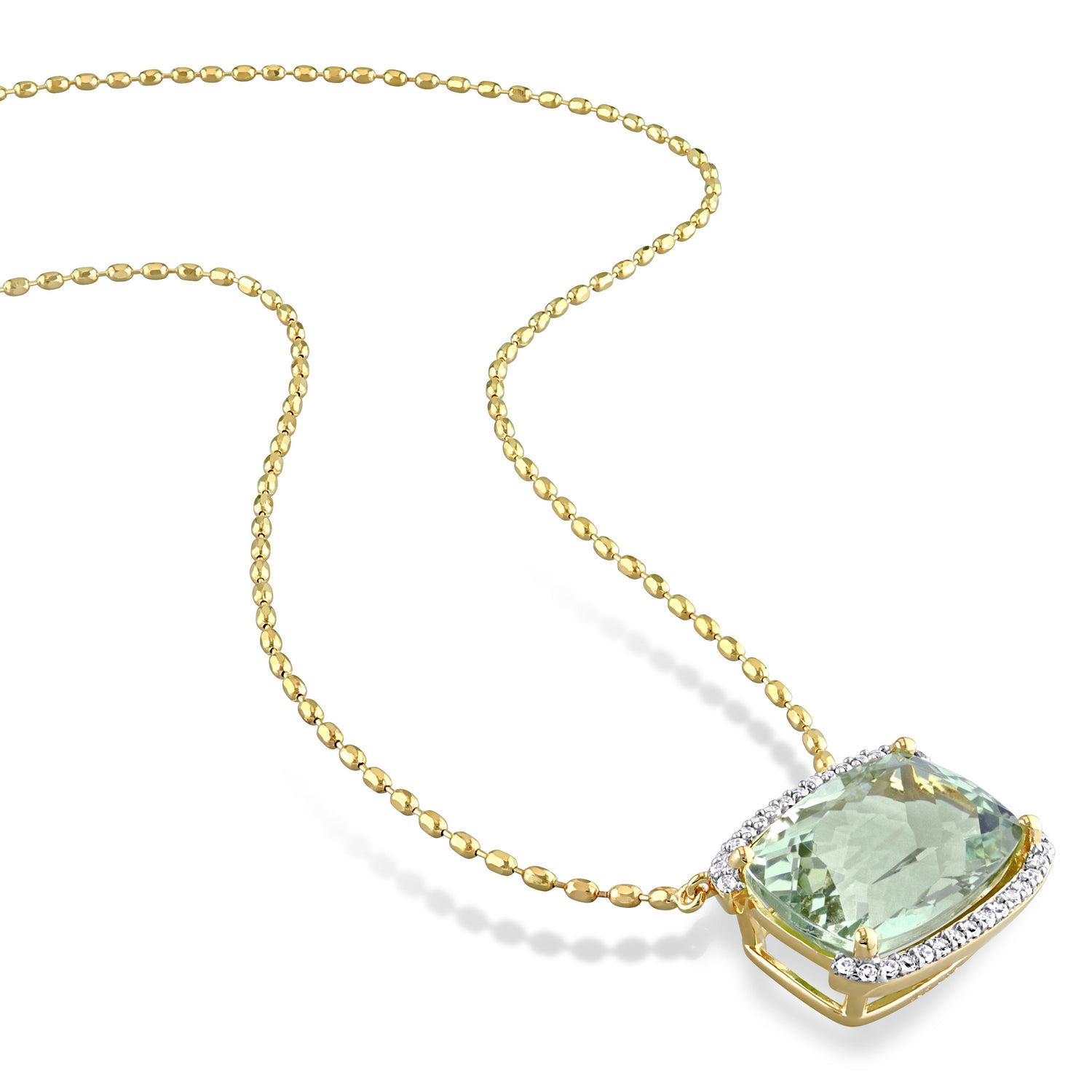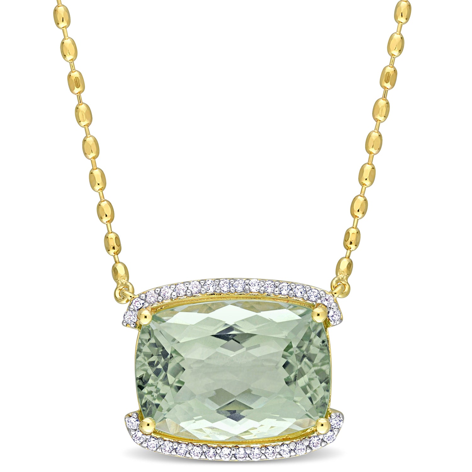Crafted in yellow gold-plated sterling silver with one cushion-cut green quartz (18x13mm) and 32 round-cut white topaz (1.2x1.2mm) gemstones. Includes an 18' diamond-cut bead chain with a lobster clasp.