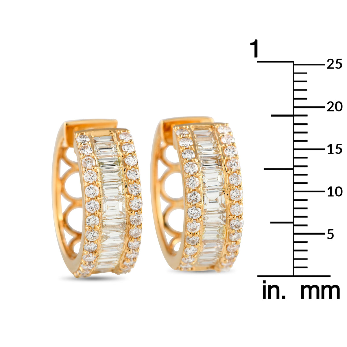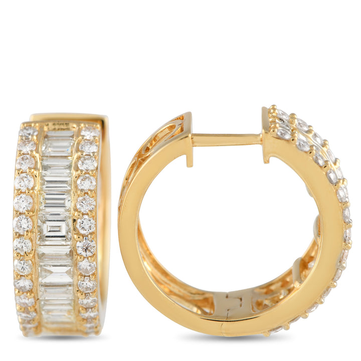 These 18K Yellow Gold 2.90ct Diamond Hoop Earrings by LB Exclusive are the ultimate expression of glamour. Bold yet sophisticated, each hoop is adorned with an exquisite mix of round-cut diamonds and baguette diamonds totaling 2.90 carats, all set in rich 18k yellow gold. Measuring 0.75 inches, these radiant earrings offer refined sparkle and make an unforgettable impression.