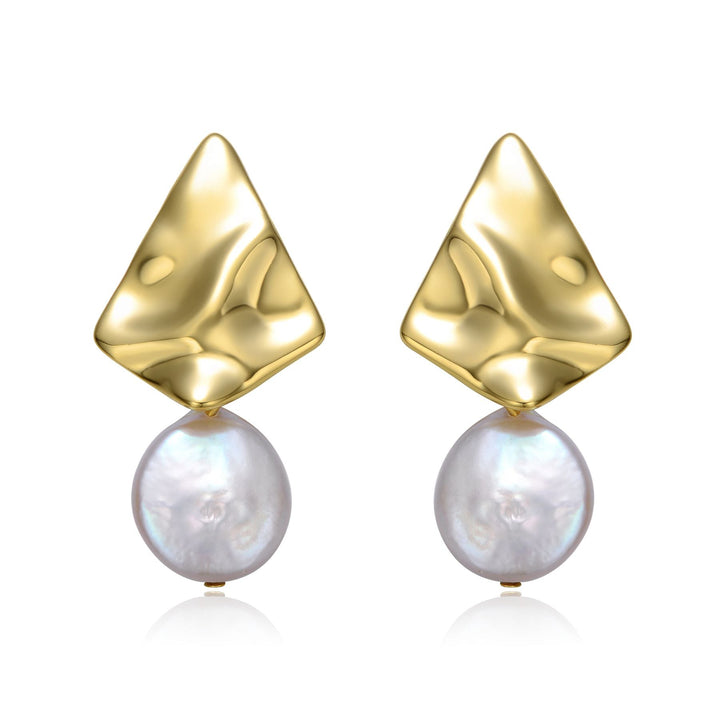 The Genevive Jewelry Sterling Silver 14k Yellow Gold Plated White Coin Pearl Drop Earrings redefine elegance with their striking 3D geometric ripple design. The statement earrings feature luminous white coin pearls, perfectly suspended beneath bold pyramid-shaped gold-plated accents. A stunning retro-inspired addition to any jewelry collection, these earrings exude sophistication and modern flair.