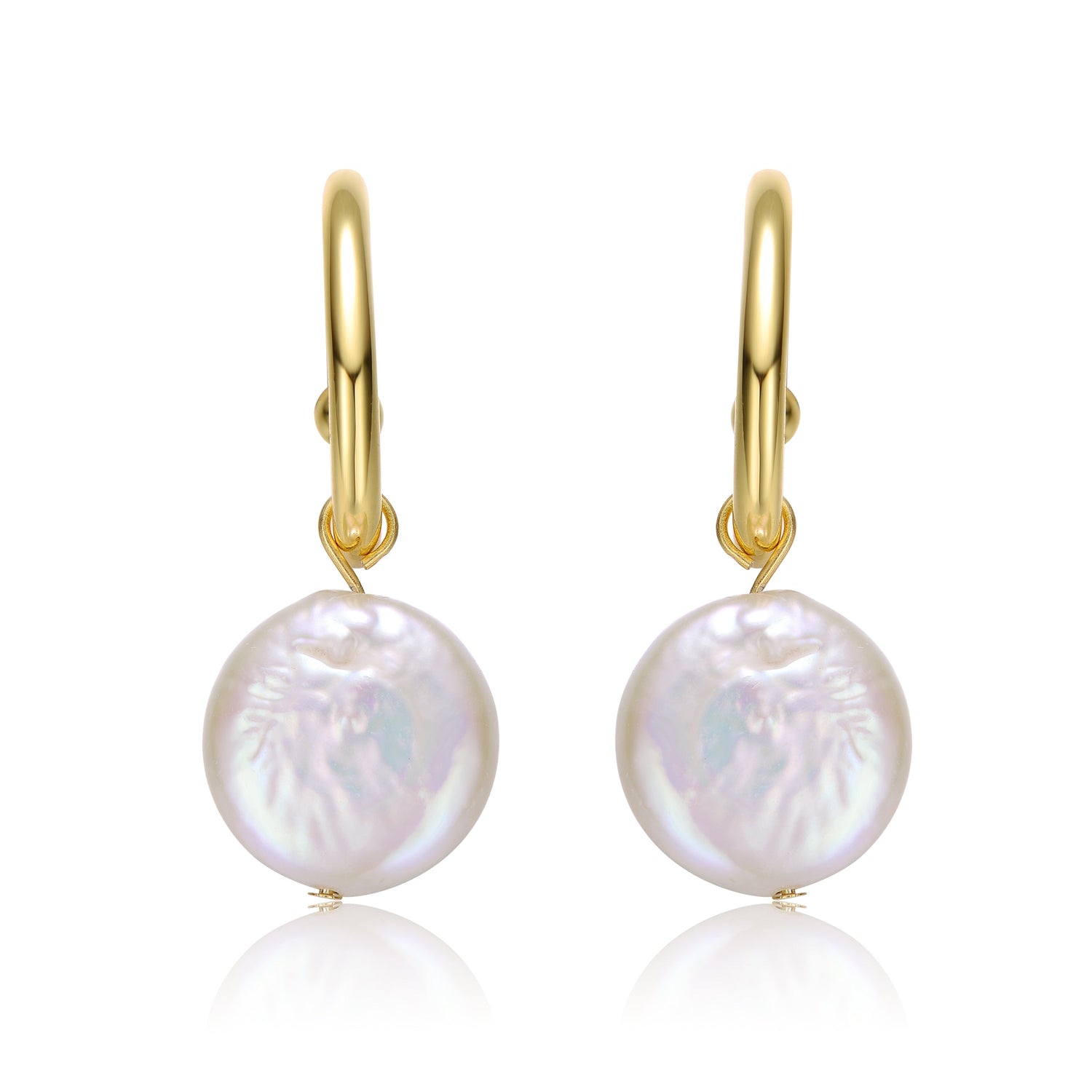Sterling silver with 14k yellow gold plating. White coin pearls (June birthstone) with a C-hoop design. Measurement: 30mm.
